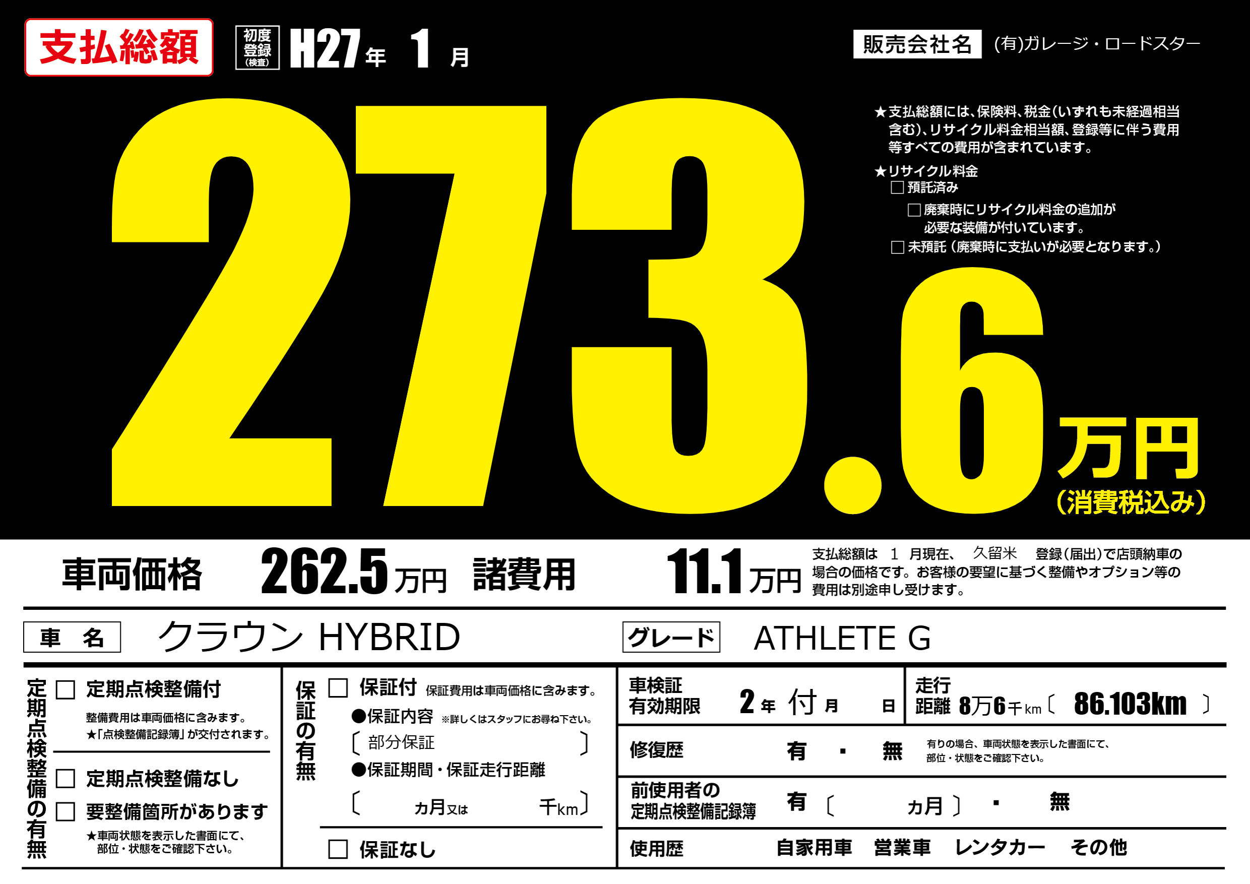 | 車名 | クラウン HYBRID | グレード ミッション 排気量 |