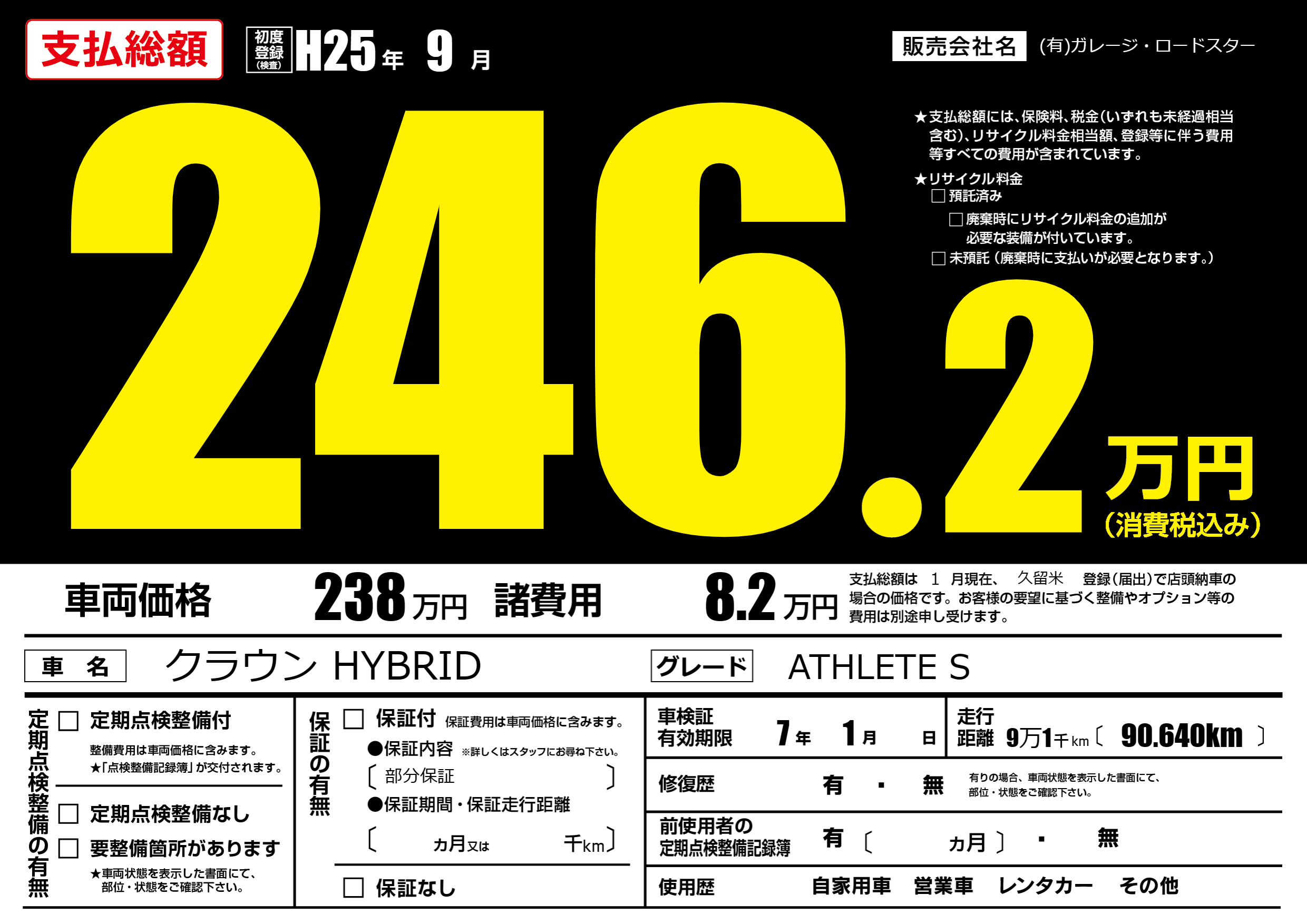 | 車名 | クラウン HYBRID | グレード ミッション 排気量 |