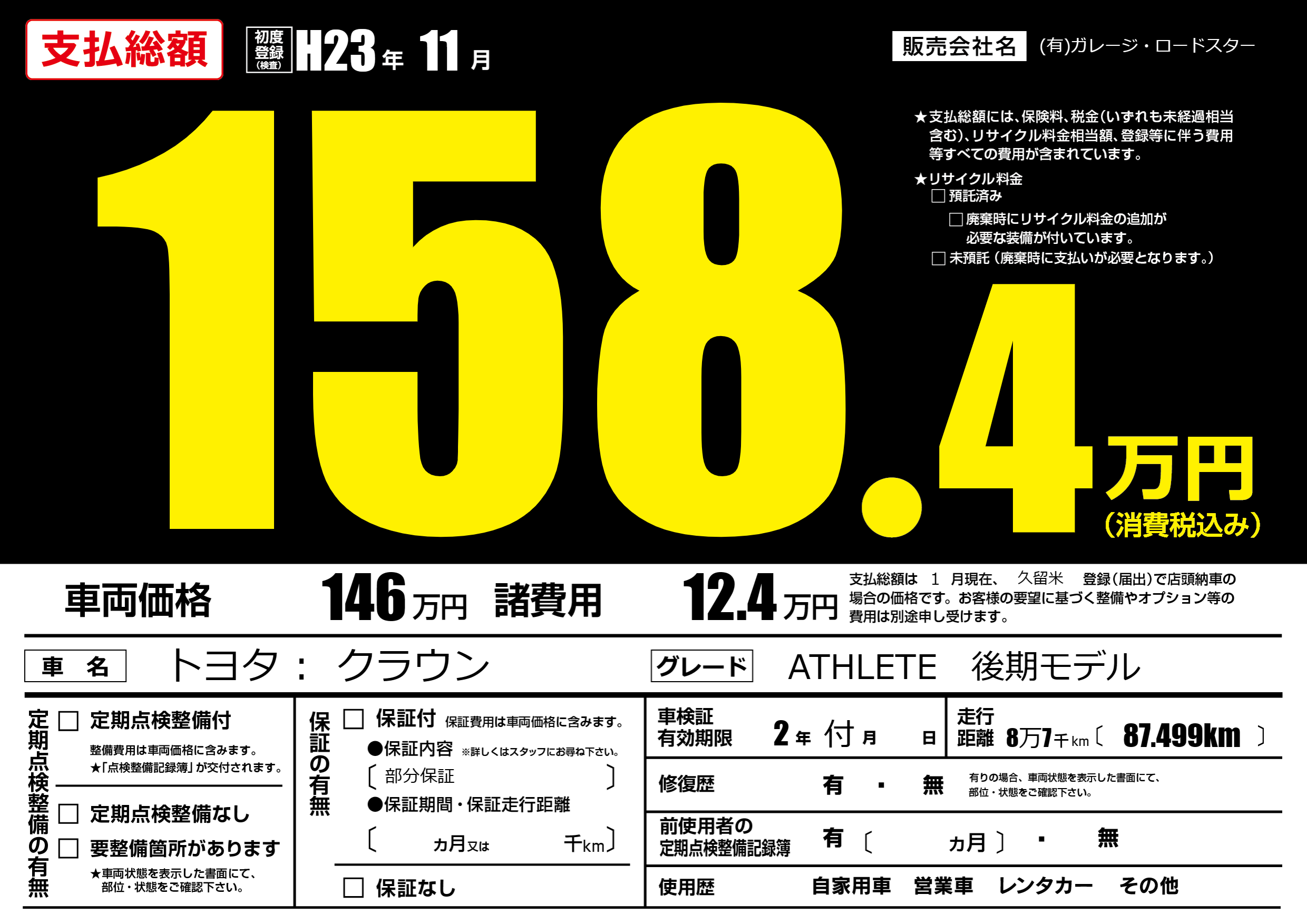 | 車名 | トヨタ : クラウン | グレード ミッション 排気量 |