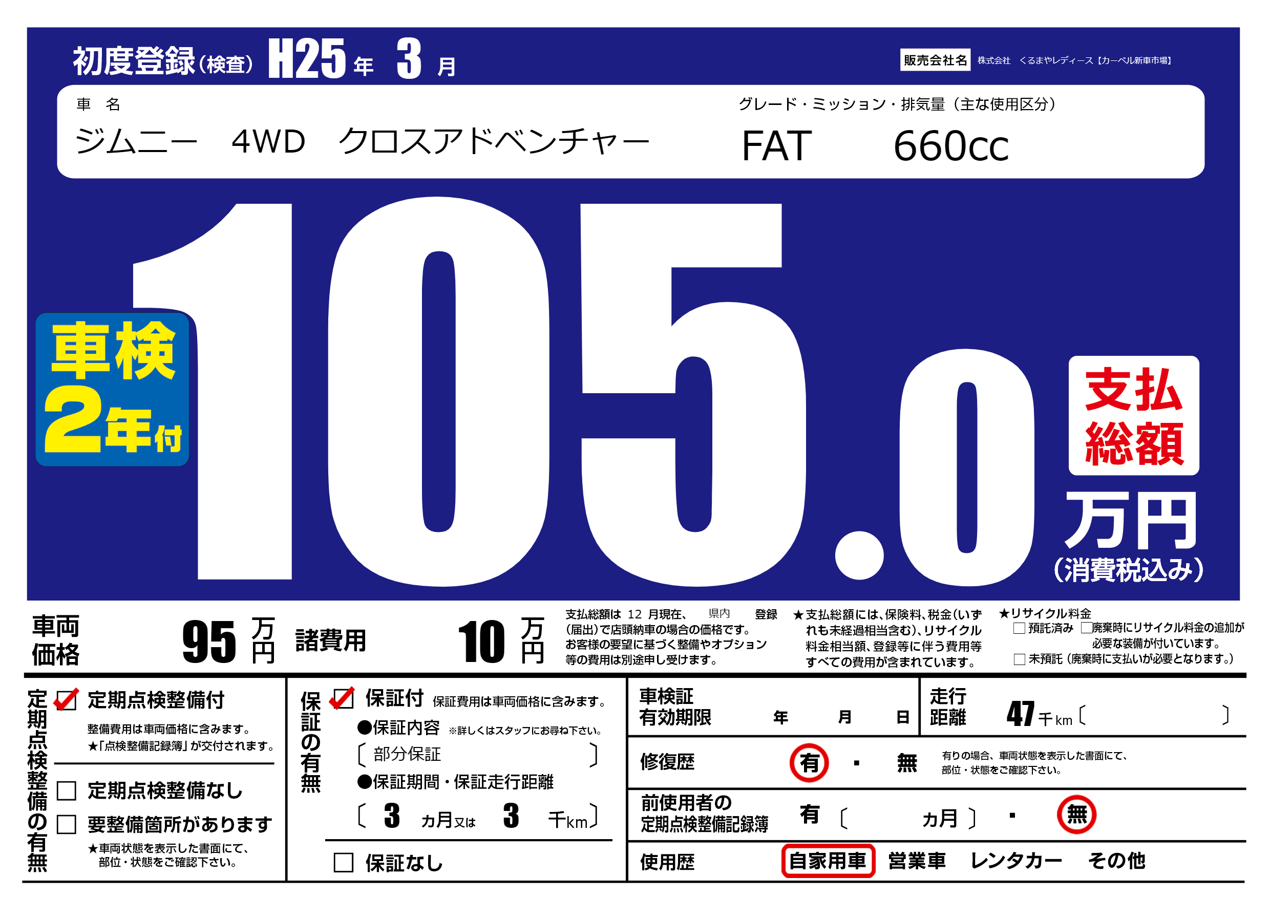 | 走行キロ | 4.7万km | 初年度登録 | H25年3月 |