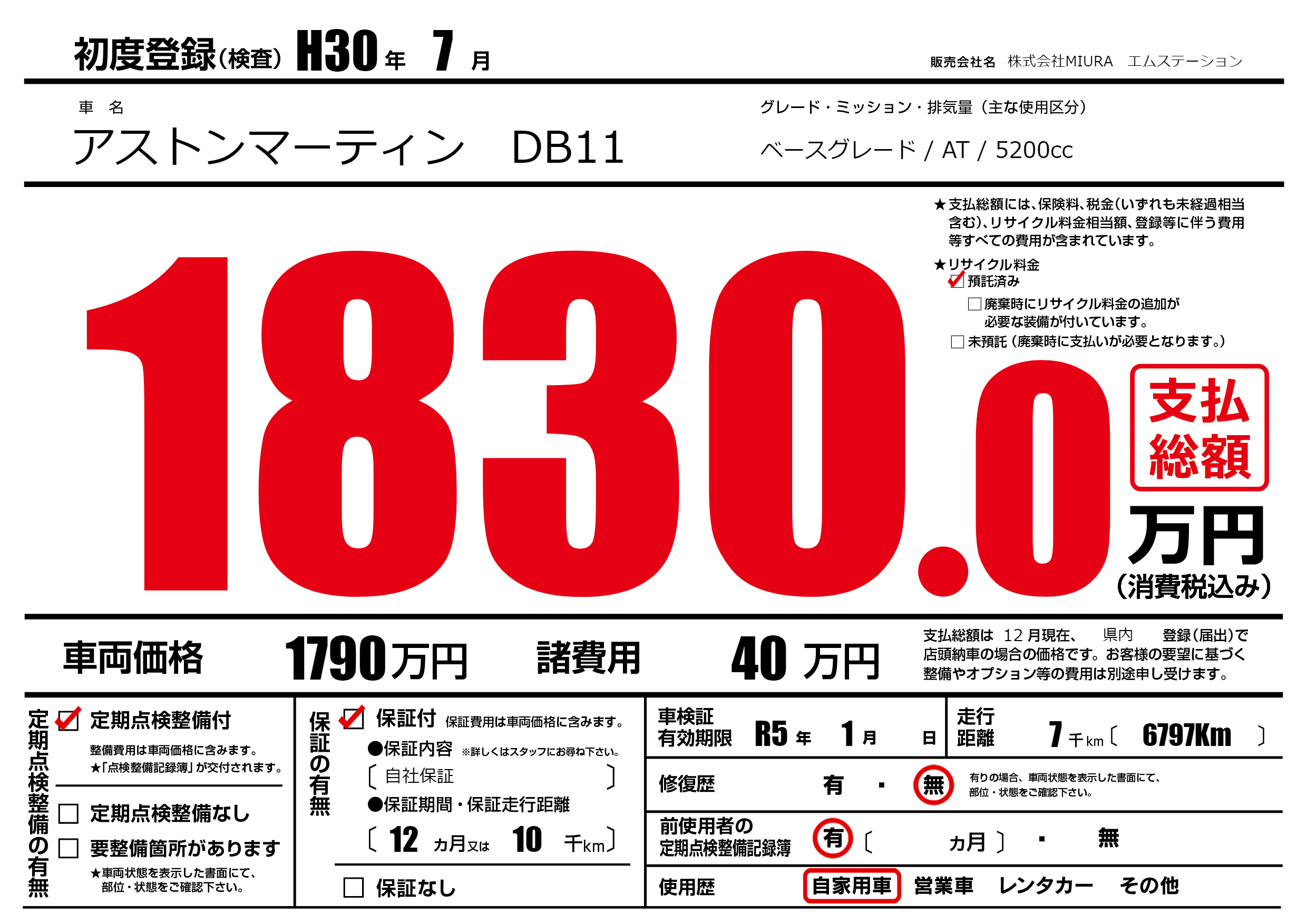| 車名 | アストンマーティン DB11 | グレード ミッション 排気量 |