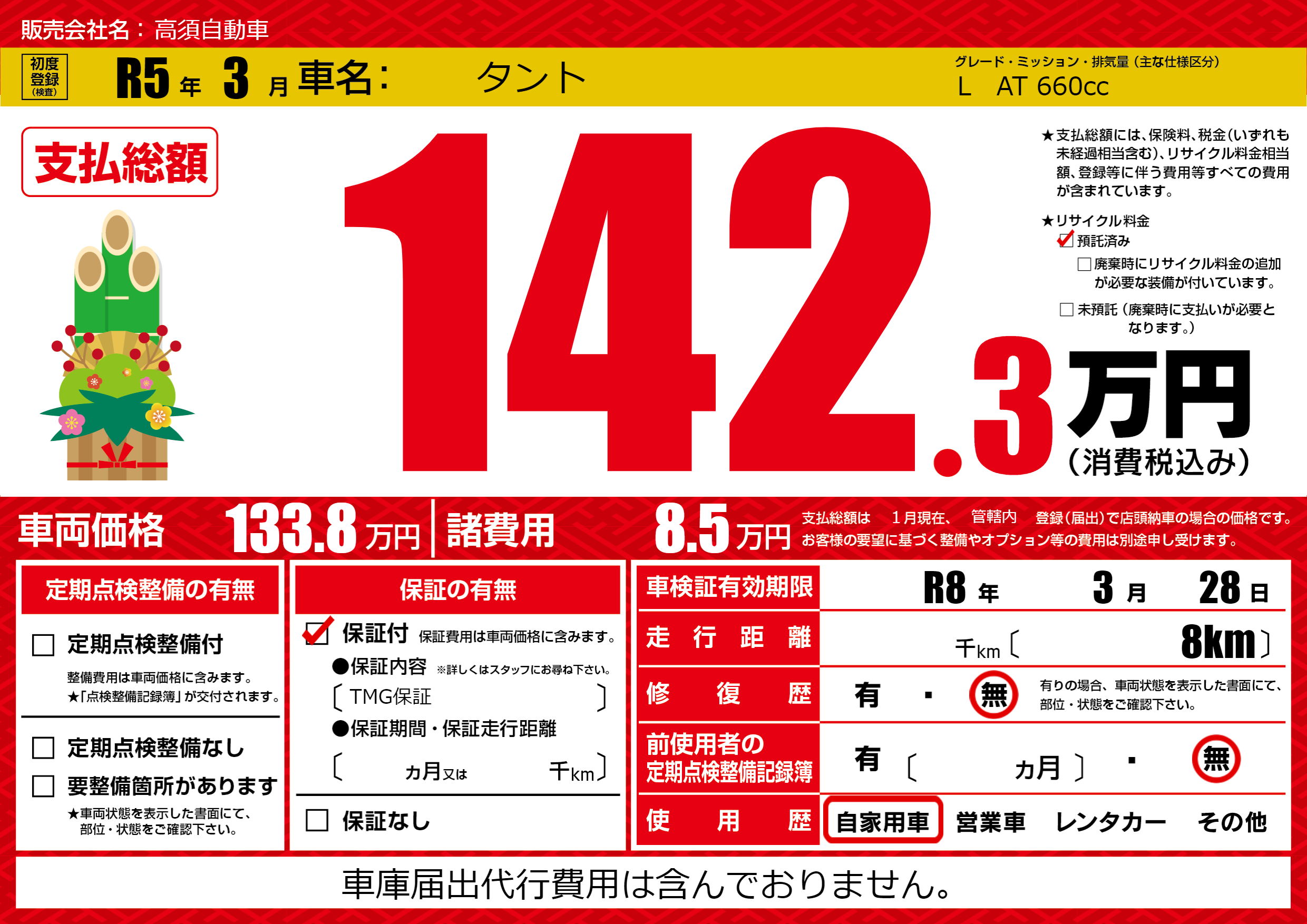 保証なし 保証内容(TMG保証) ---ヶ月または()千kmまで |