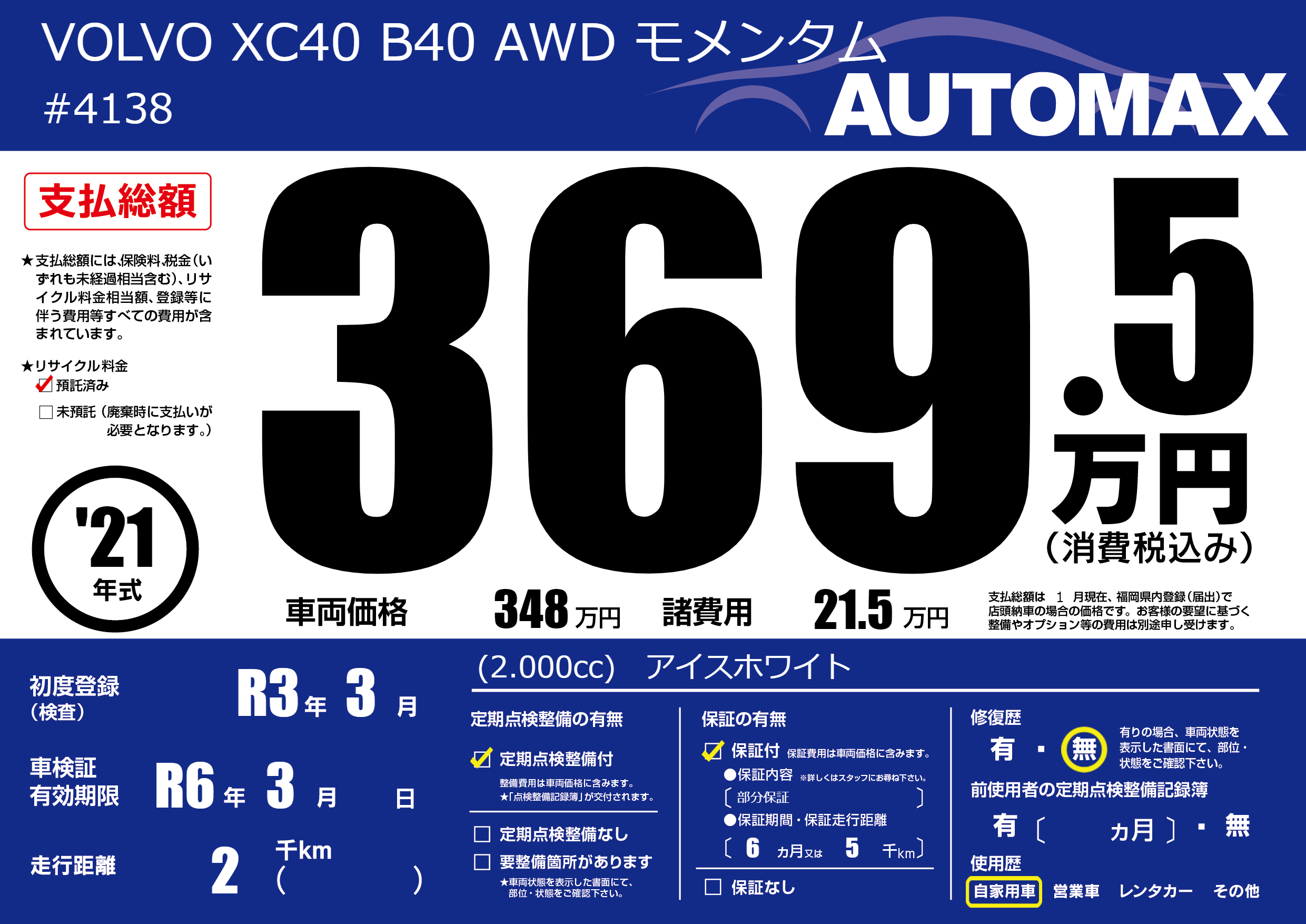 | 車名 | VOLVO XC40 B40 AWD モメンタム | グレード ミッション 排気量 |