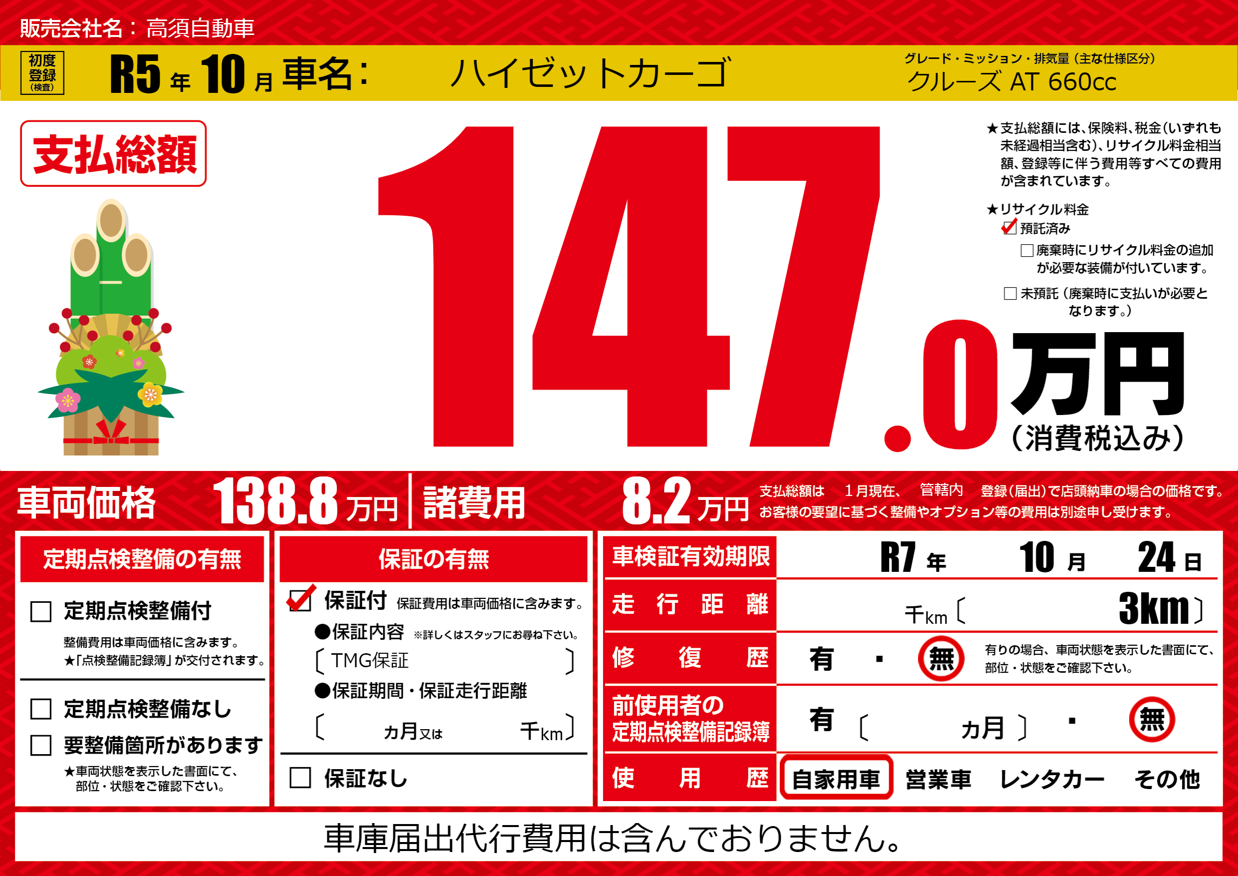 | 車名 | ハイゼットカーゴ | グレード ミッション 排気量 |