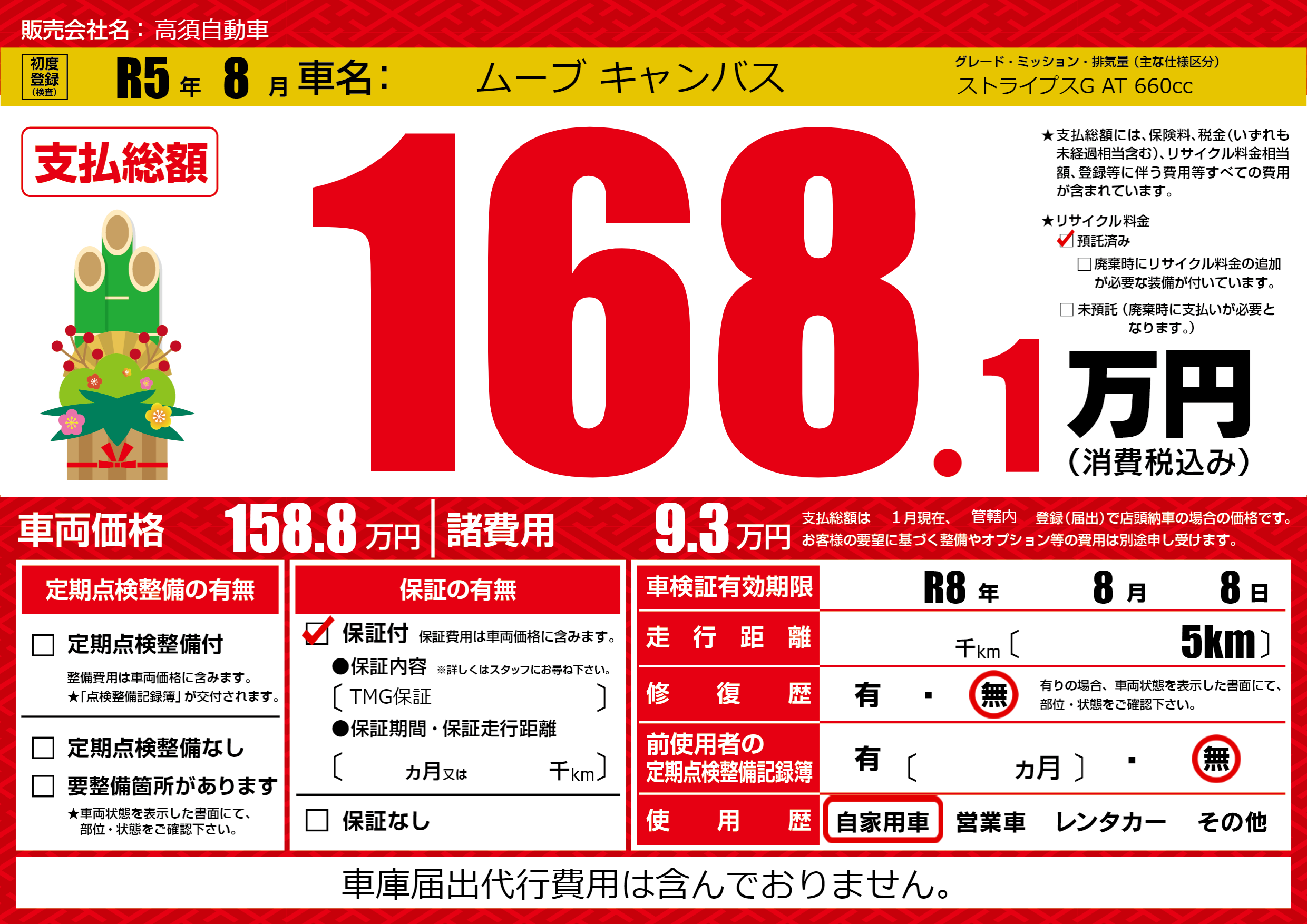 | 走行キロ | - | 初年度登録 | R5年8月 |
