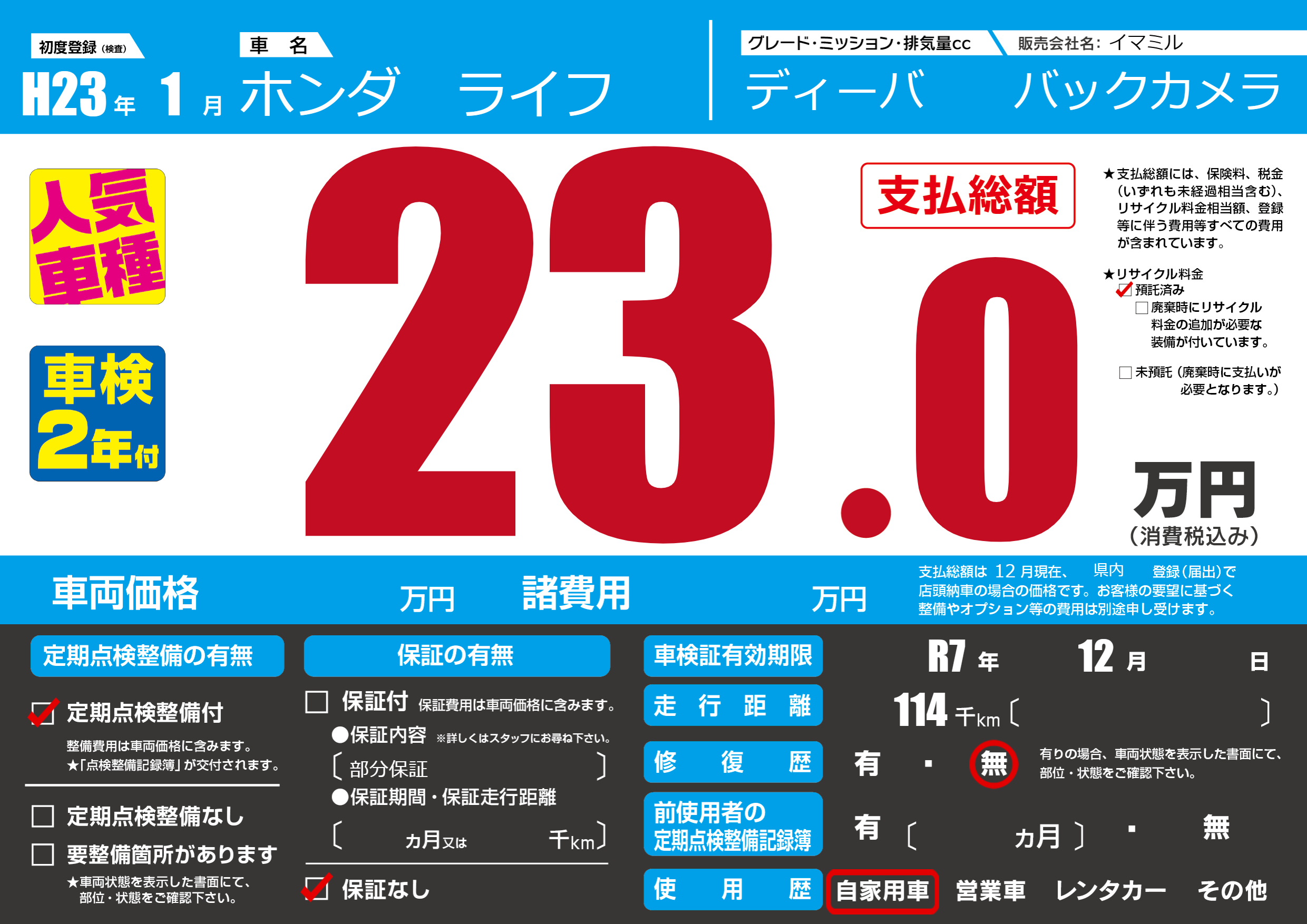 | 走行キロ | 11.4万km | 初年度登録 | H23年1月 |