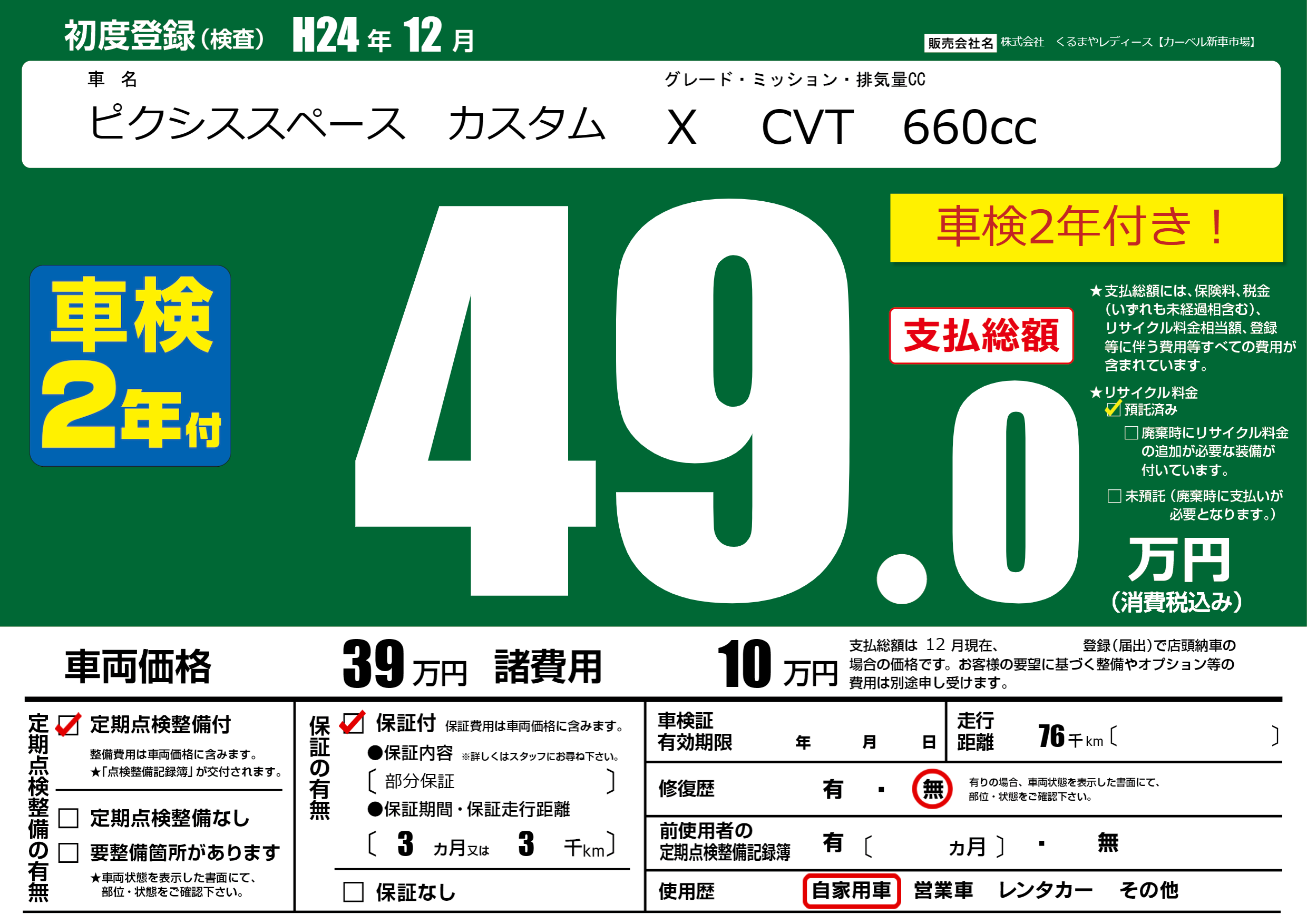 | 走行キロ | 7.6万km | 初年度登録 | H24年12月 |
