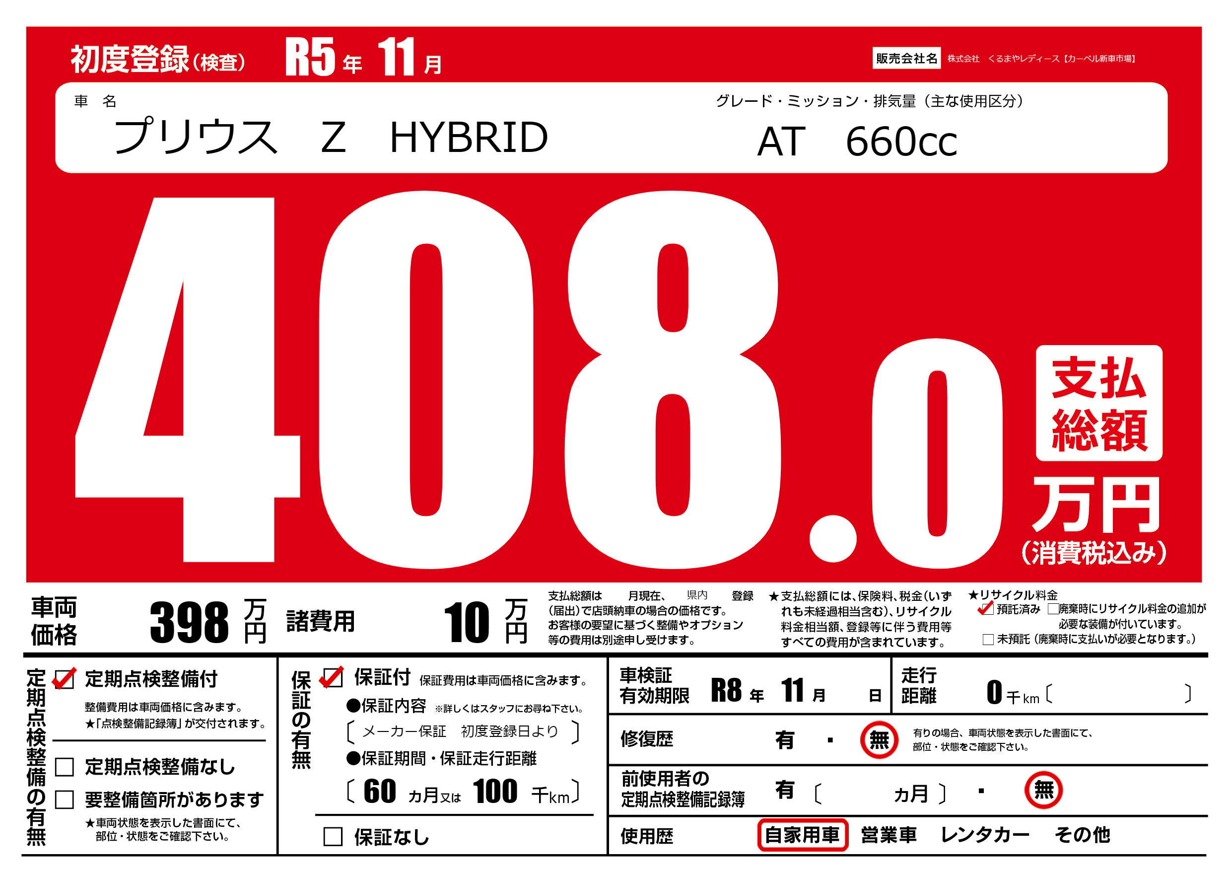 | 車名 | プリウス Z HYBRID | グレード ミッション 排気量 |
