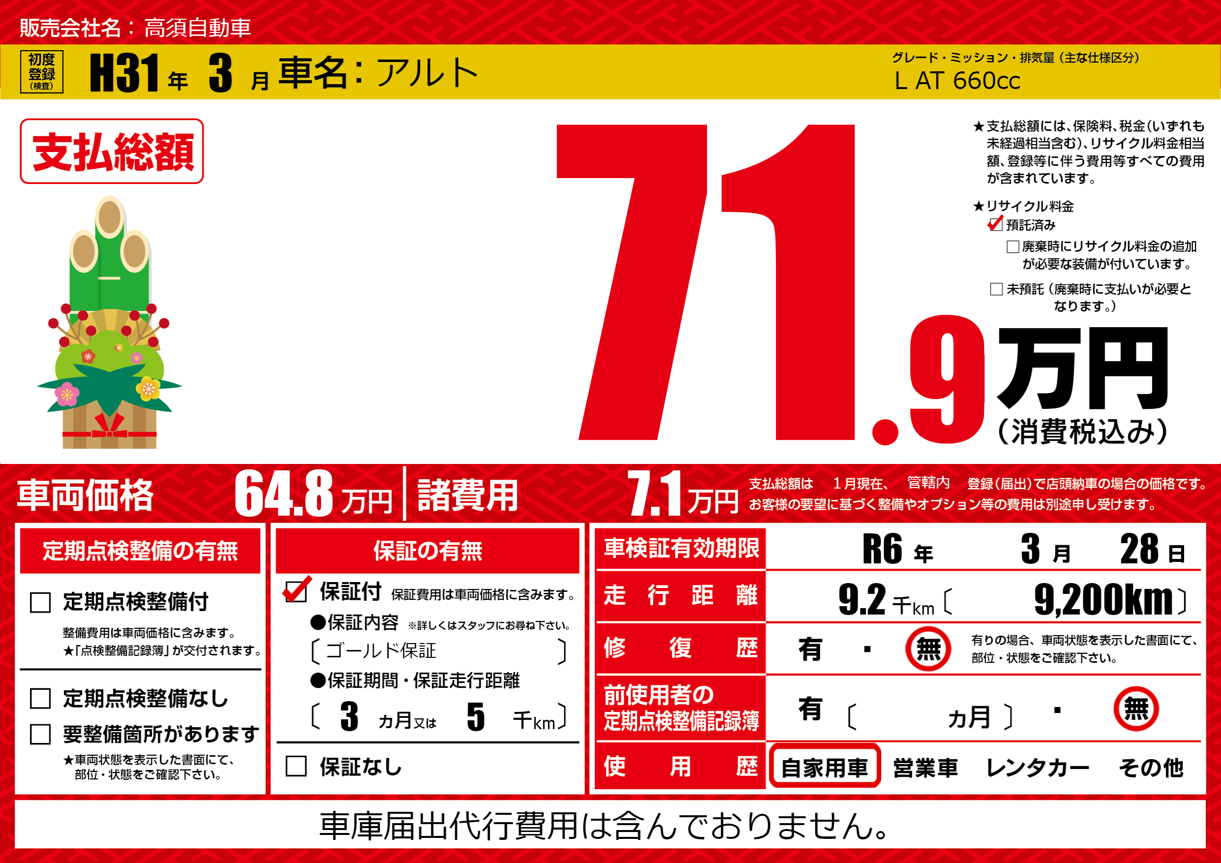保証なし 保証内容(ゴールド保証) 3ヶ月または(5)千kmまで |