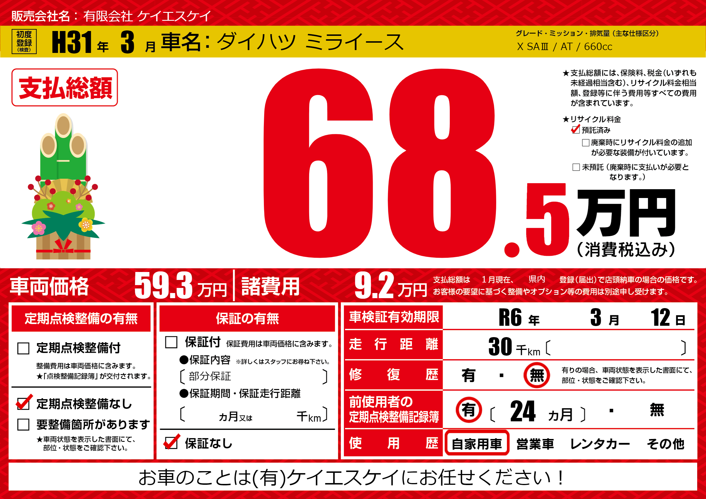 | 走行キロ | 3万km | 初年度登録 | H31年3月 |