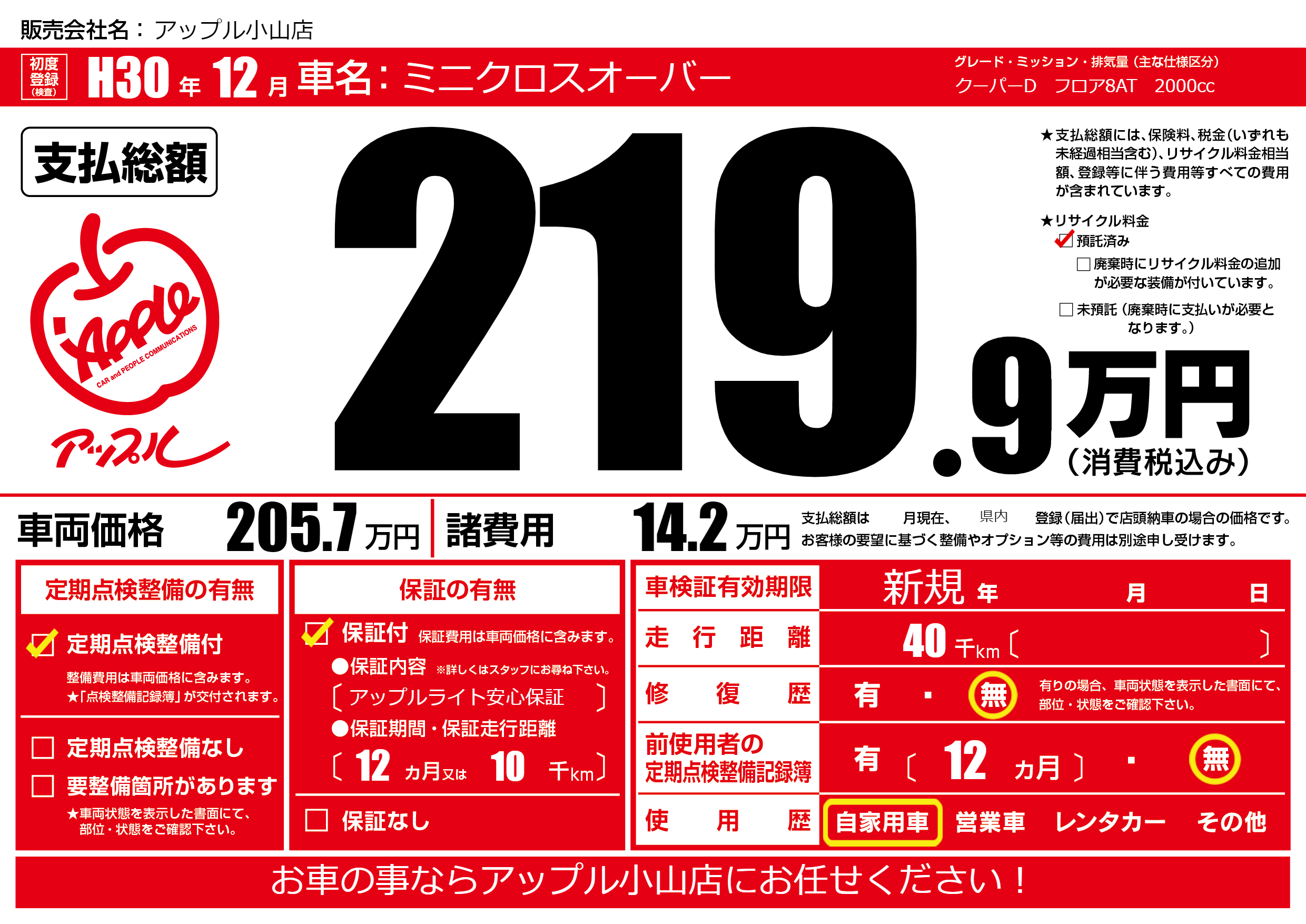 | 走行キロ | 4万km | 初年度登録 | H30年12月 |