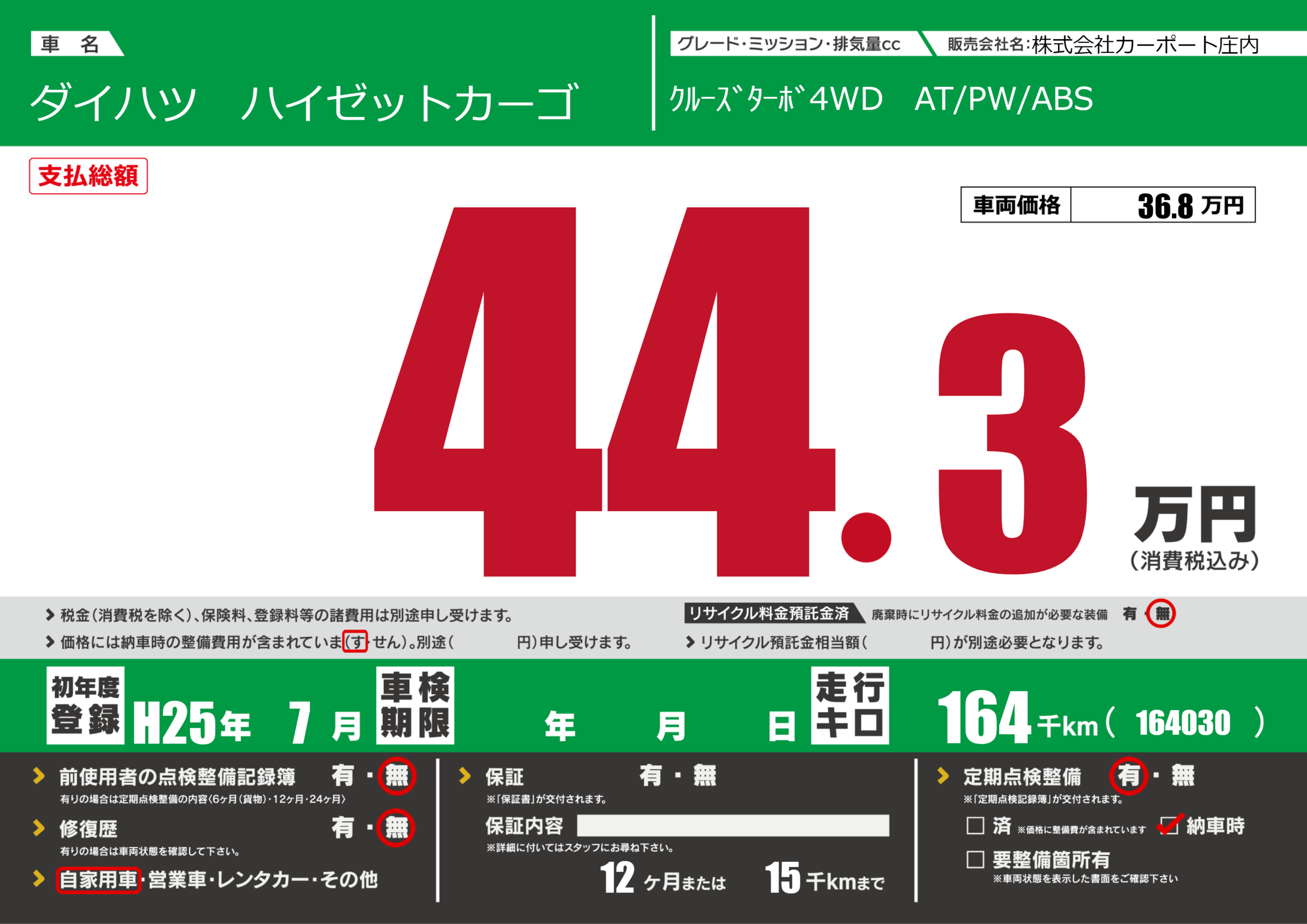| 車名 | ダイハツ ハイゼットカーゴ | グレード ミッション 排気量 |