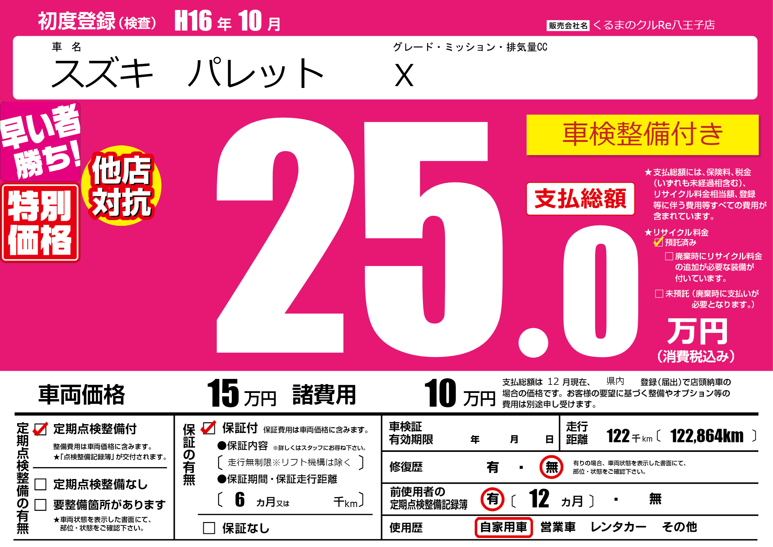 | 車名 | スズキ パレット | グレード ミッション 排気量 |