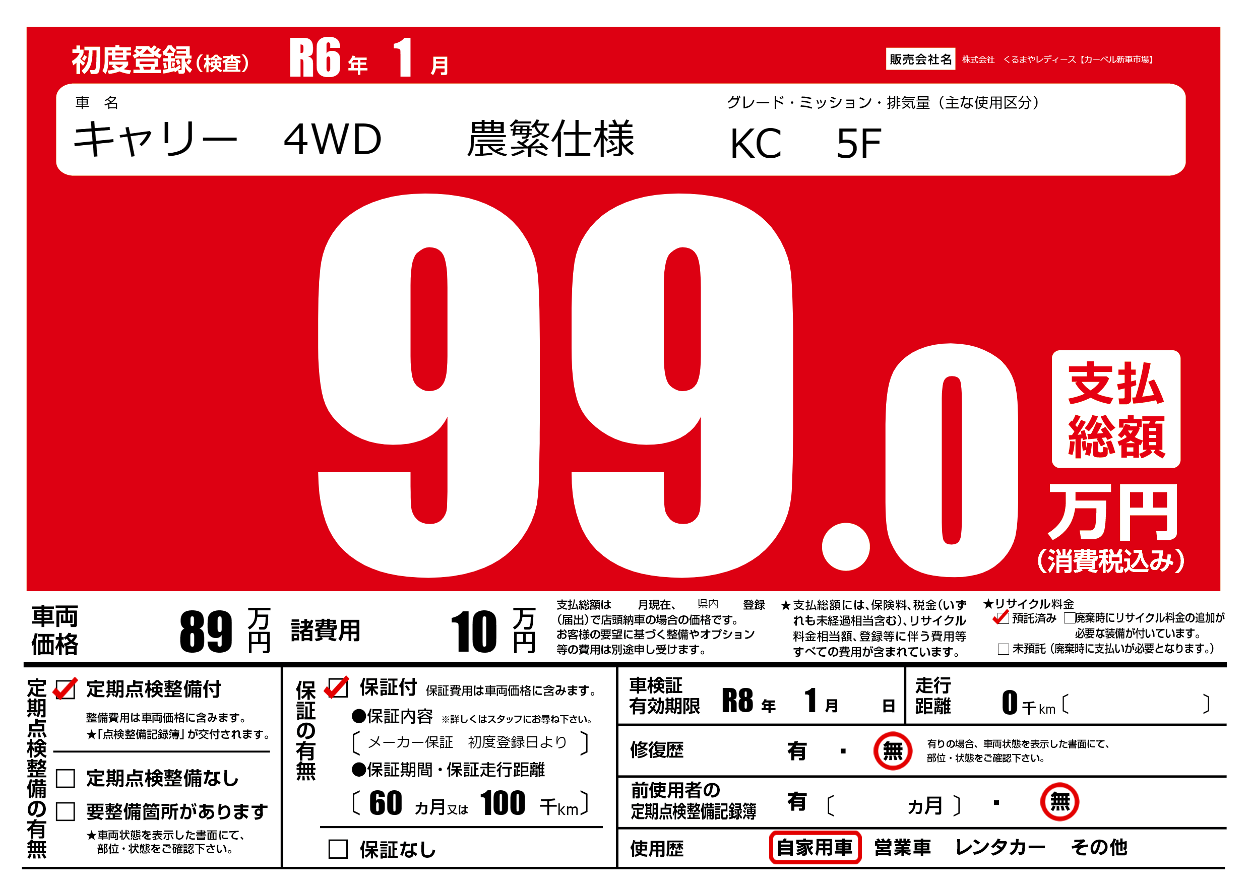 | 車名 | キャリー 4WD 農繁仕様 | グレード ミッション 排気量 |