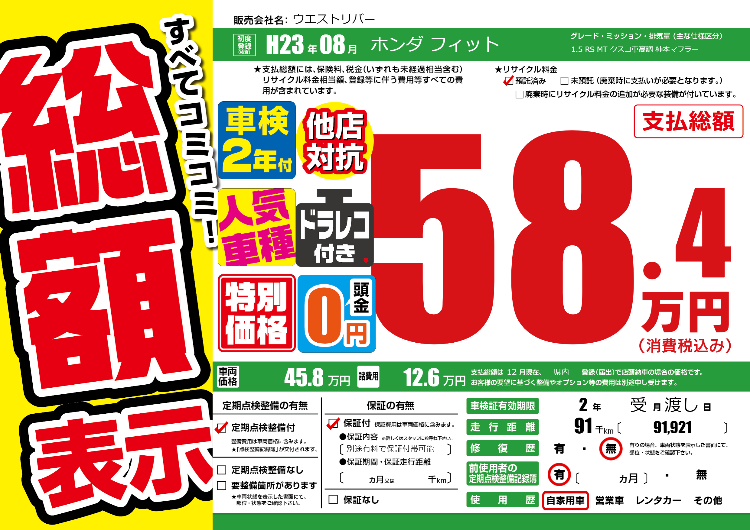 | 走行キロ | 9.1万km | 初年度登録 | H23年08月 |