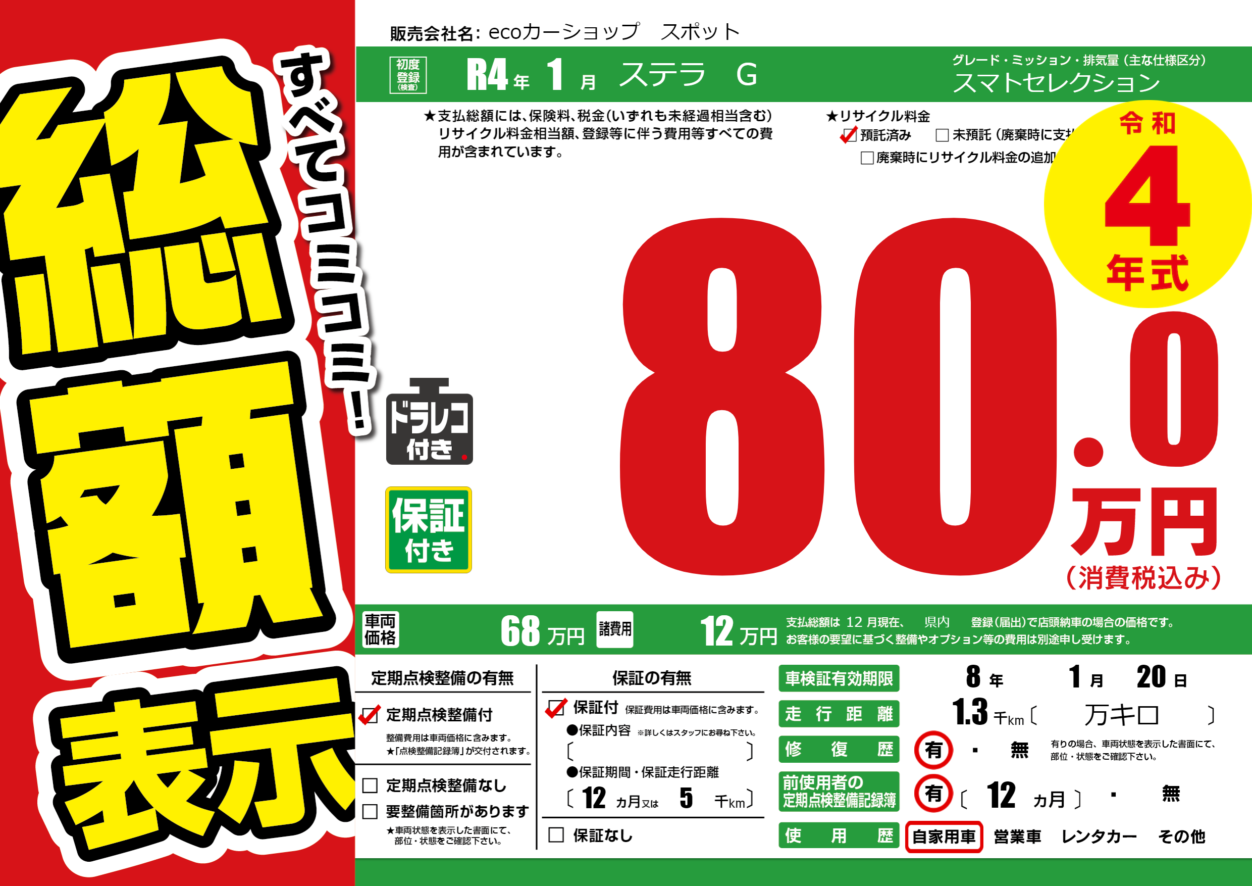 | 車名 | ステラ G | グレード ミッション 排気量 |