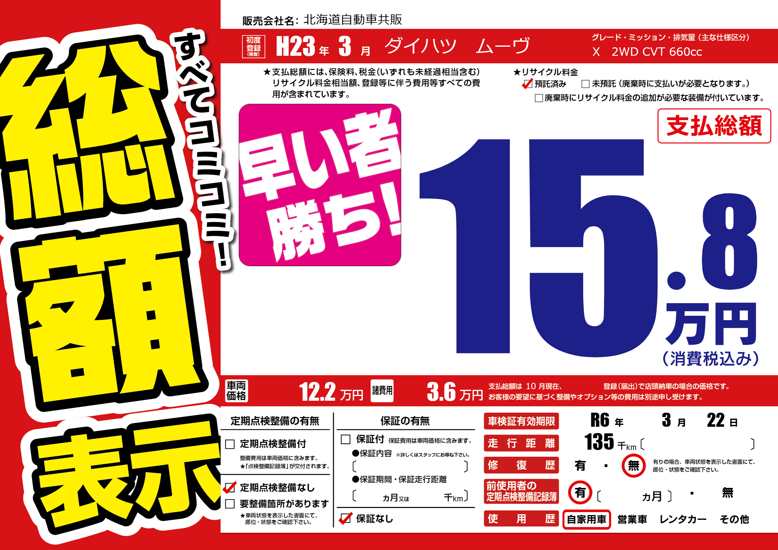 | 走行キロ | 13.5万km | 初年度登録 | H23年3月 |