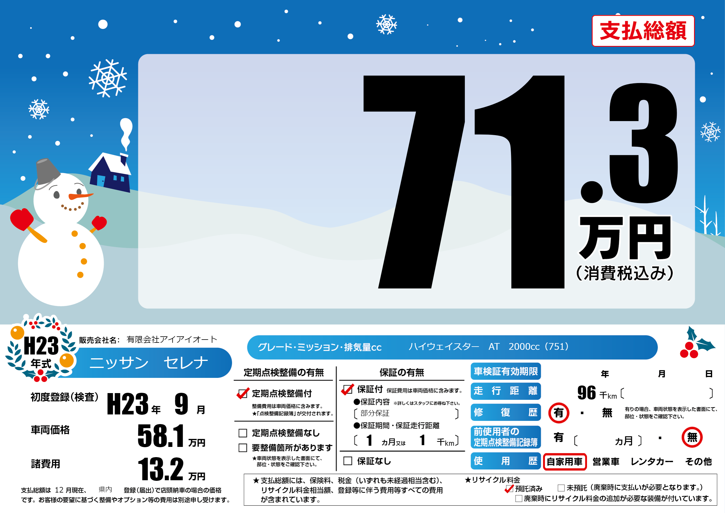 | 走行キロ | 9.6万km | 初年度登録 | H23年9月 |