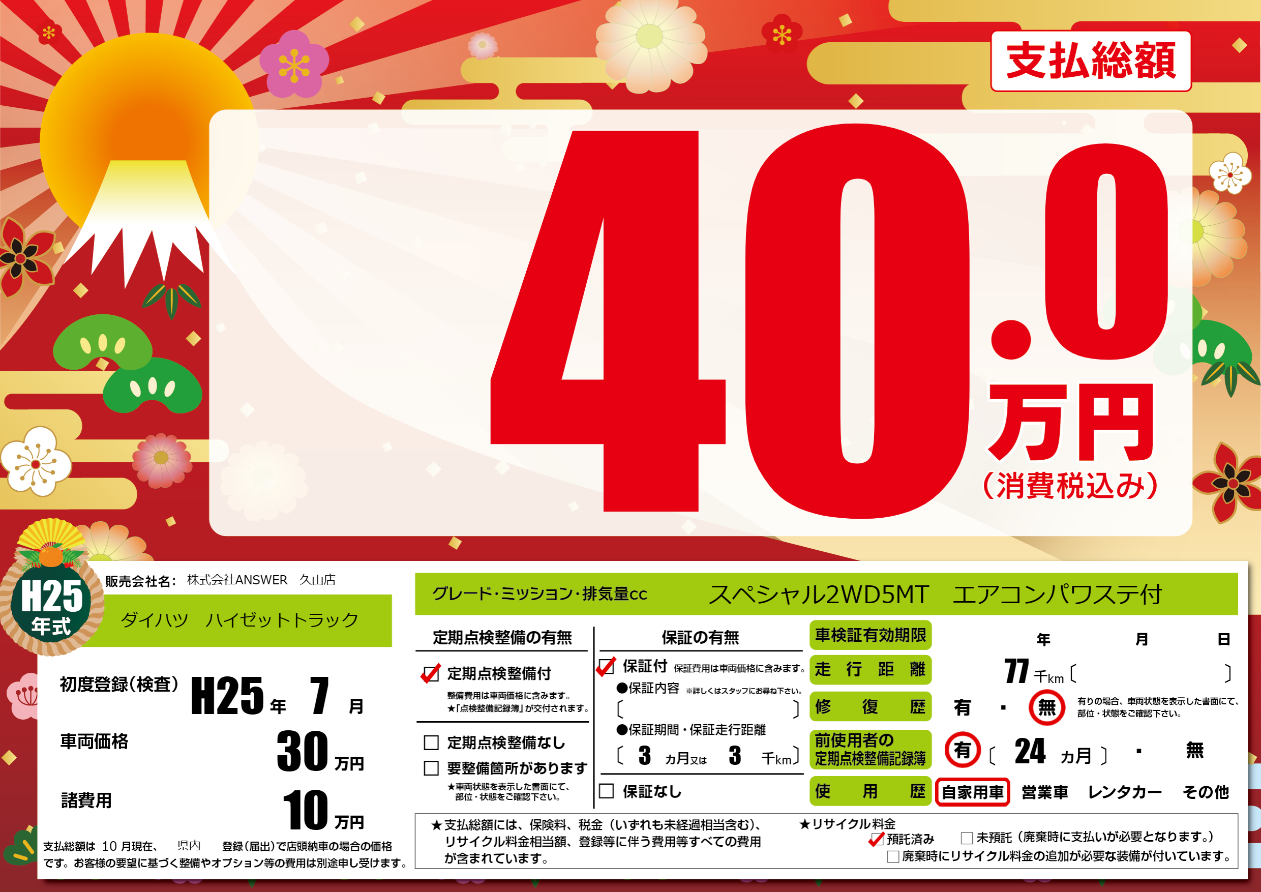| 走行キロ | 7.7万km | 初年度登録 | H25年7月 |