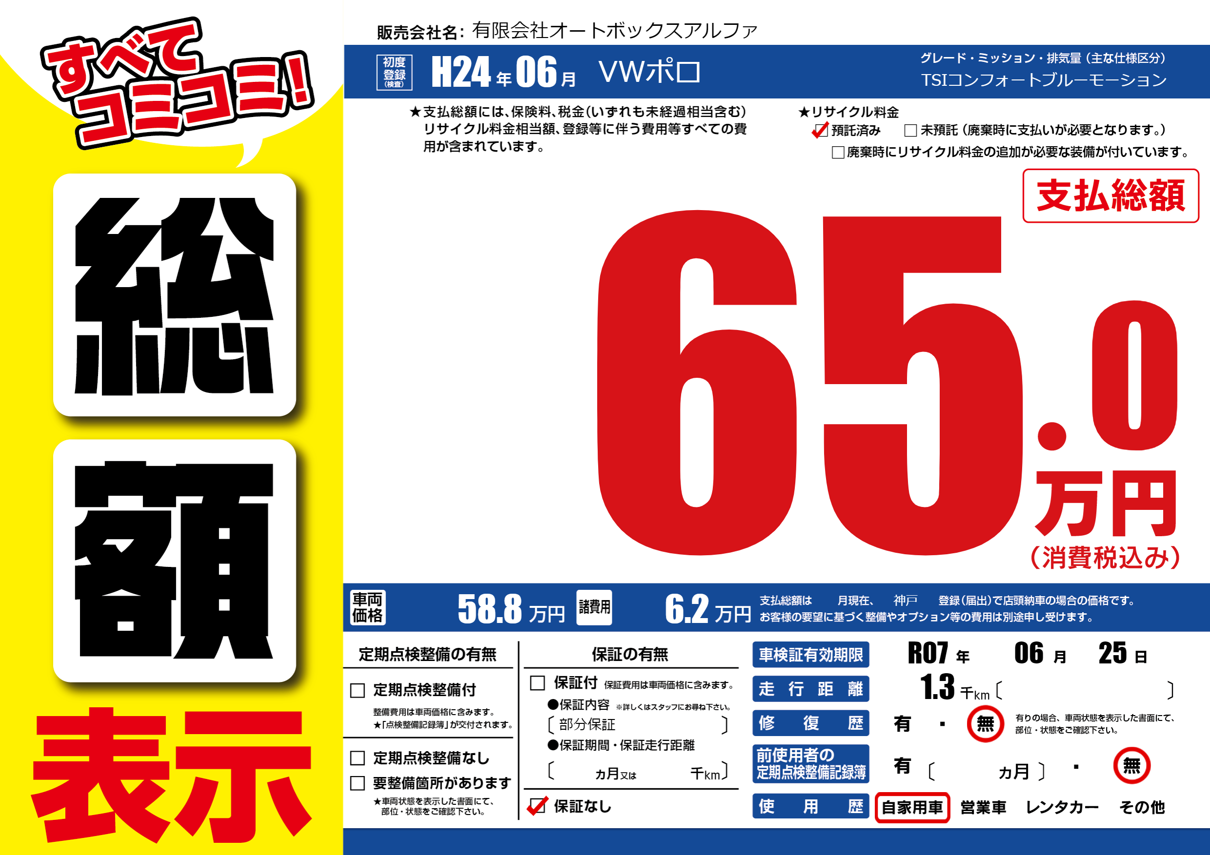 | 車名 | VWポロ | グレード ミッション 排気量 |