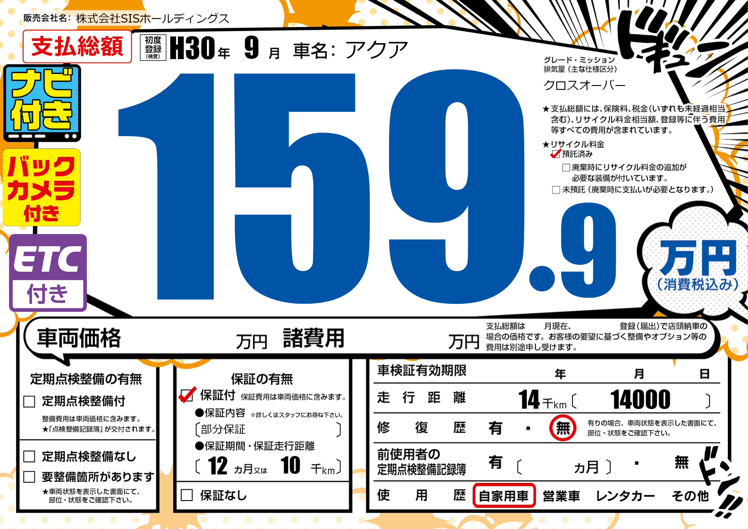 | 走行キロ | 1.4万km | 初年度登録 | H30年9月 |