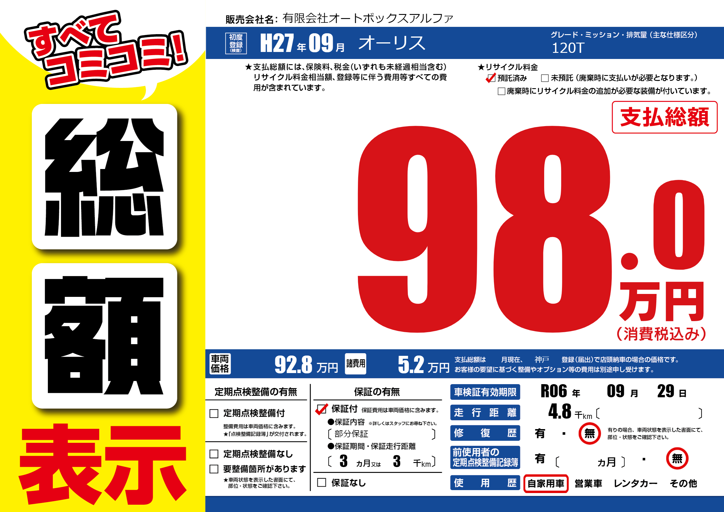 | 車名 | オーリス | グレード ミッション 排気量 |