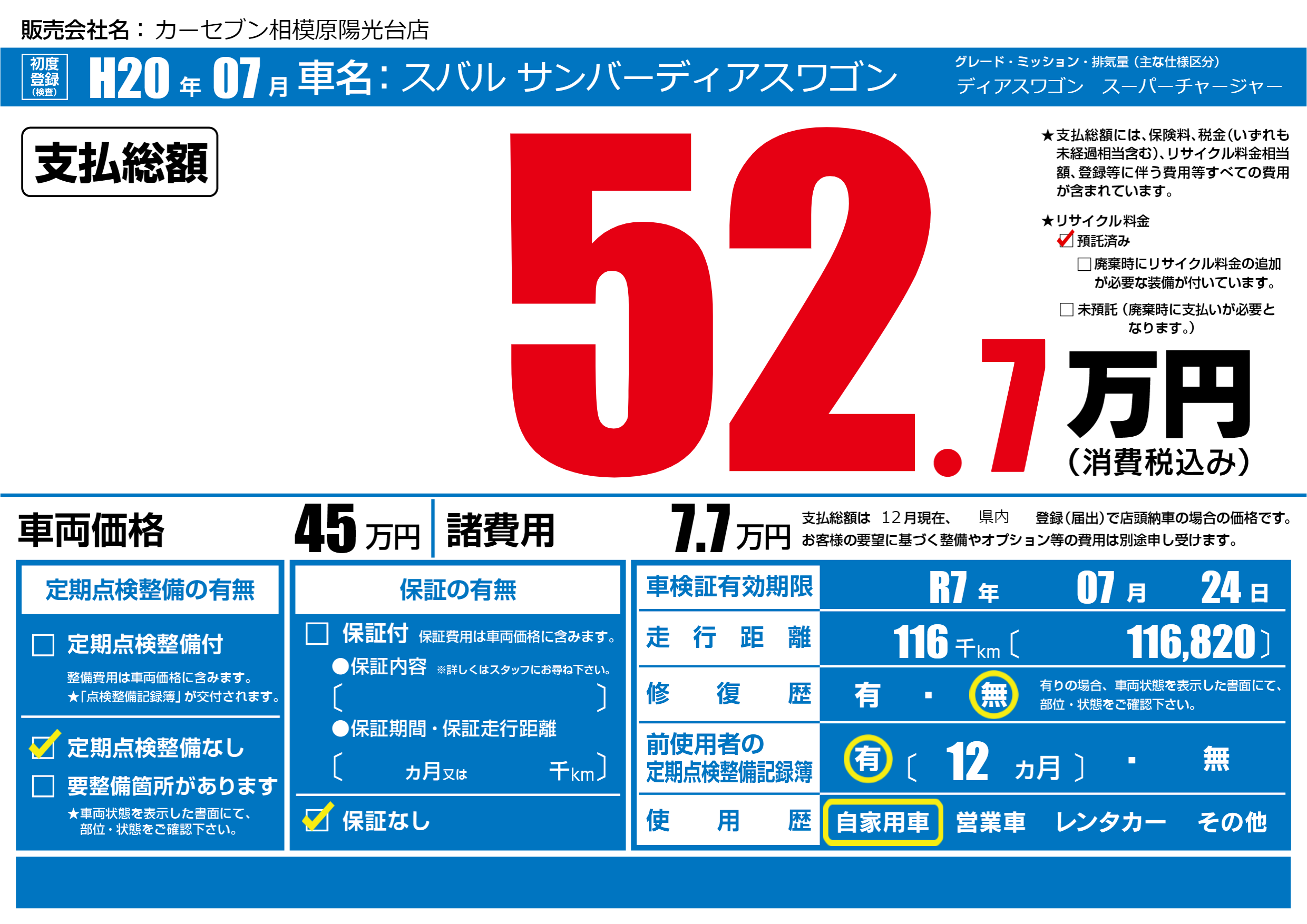 | 車名 | スバル サンバーディアスワゴン | グレード ミッション 排気量 |