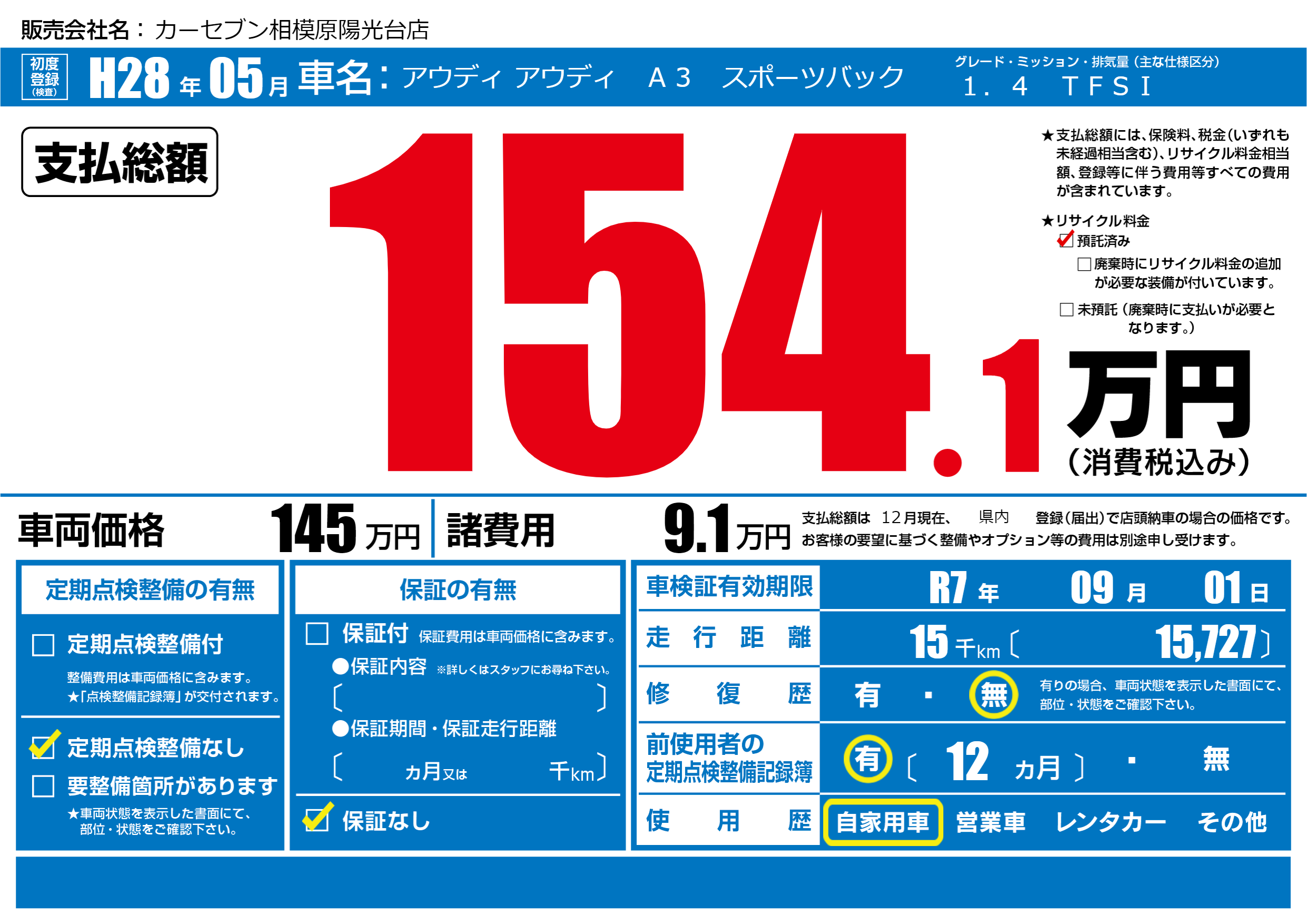 | 車名 | アウディ アウディ A3 スポーツバック | グレード ミッション 排気量 |