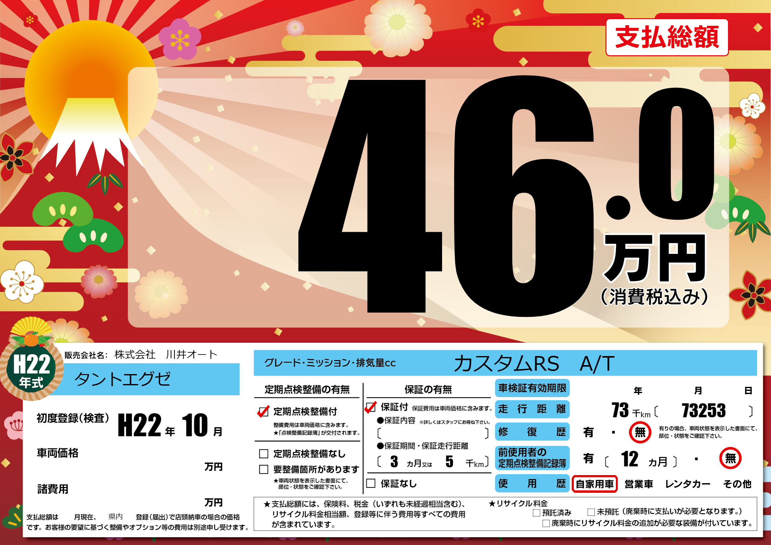 | 走行キロ | 7.3万km | 初年度登録 | H22年10月 |