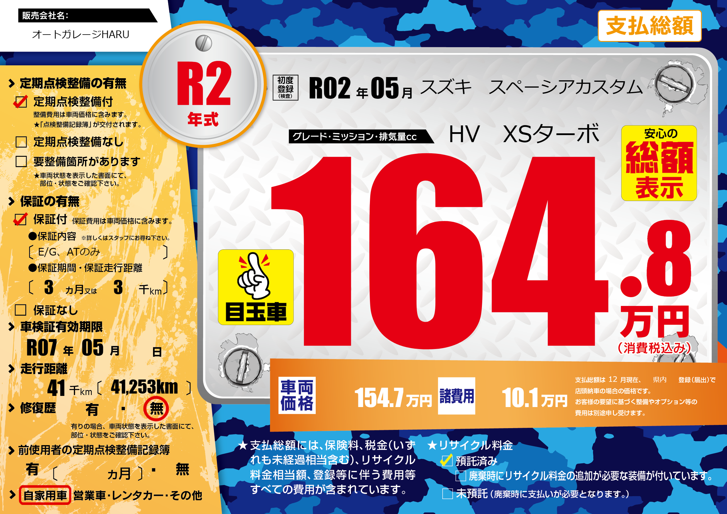 | 車名 | スズキ スペーシアカスタム | グレード ミッション 排気量 |