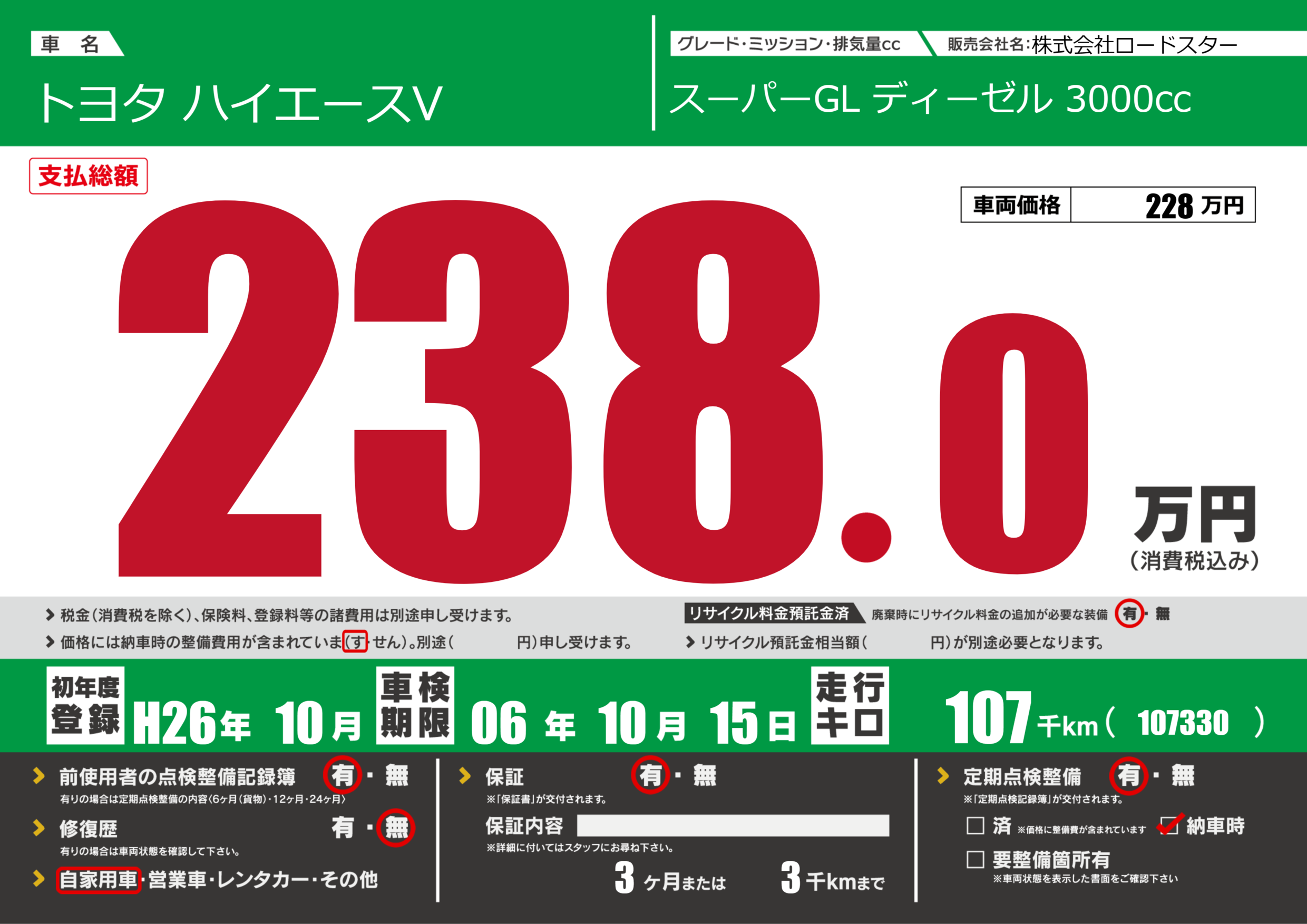| 定期点検整備 | 定期点検整備あり 納車時あり | ||