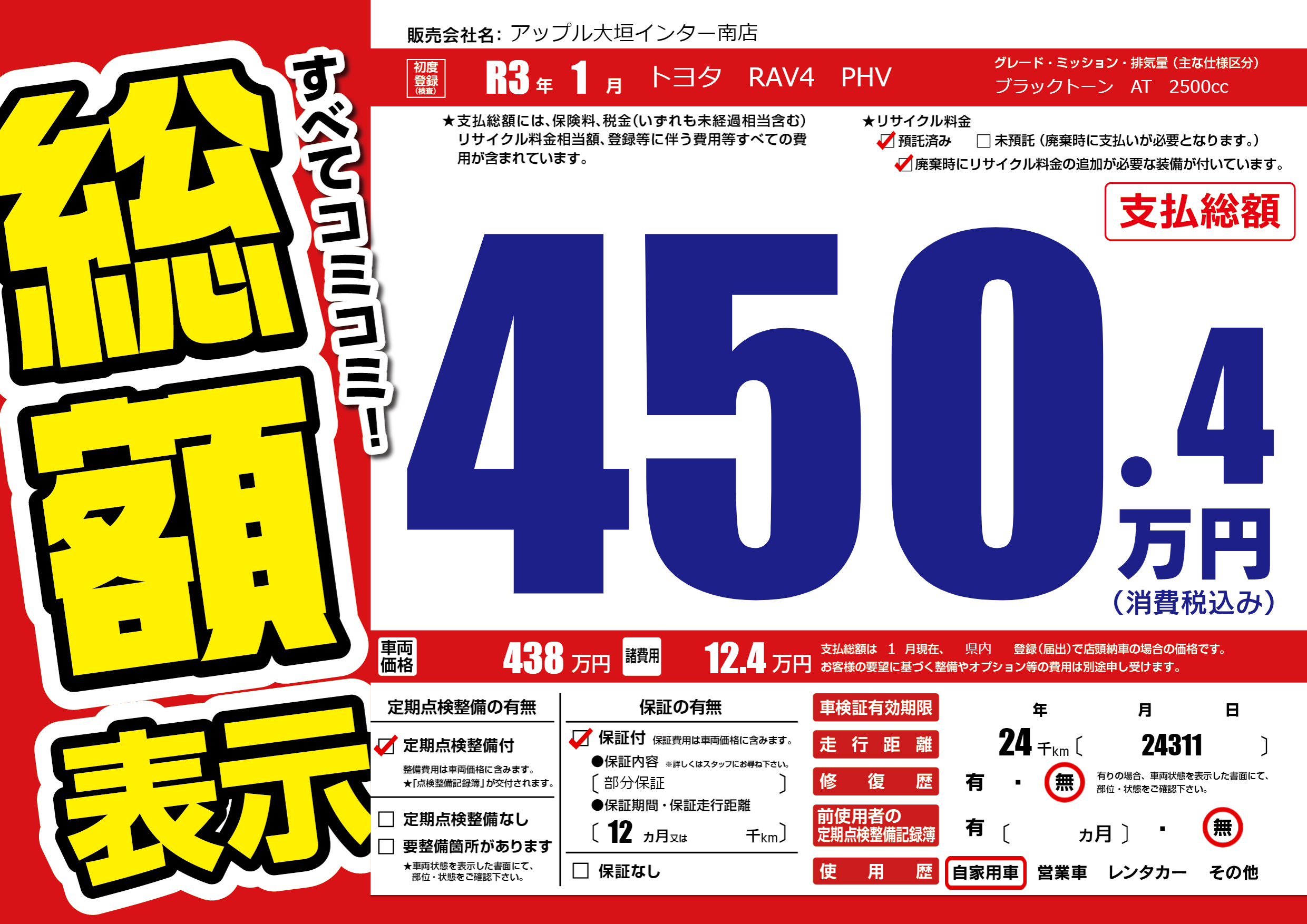 | 車名 | トヨタ RAV4 PHV | グレード ミッション 排気量 |