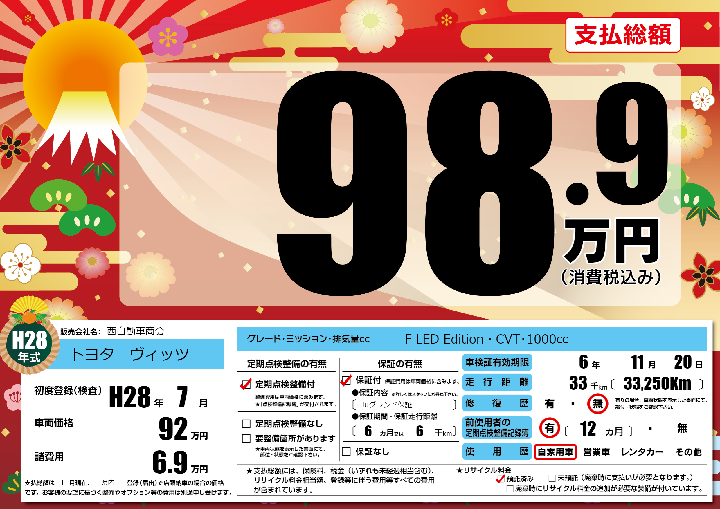 | 走行キロ | 3.3万km | 初年度登録 | H28年7月 |