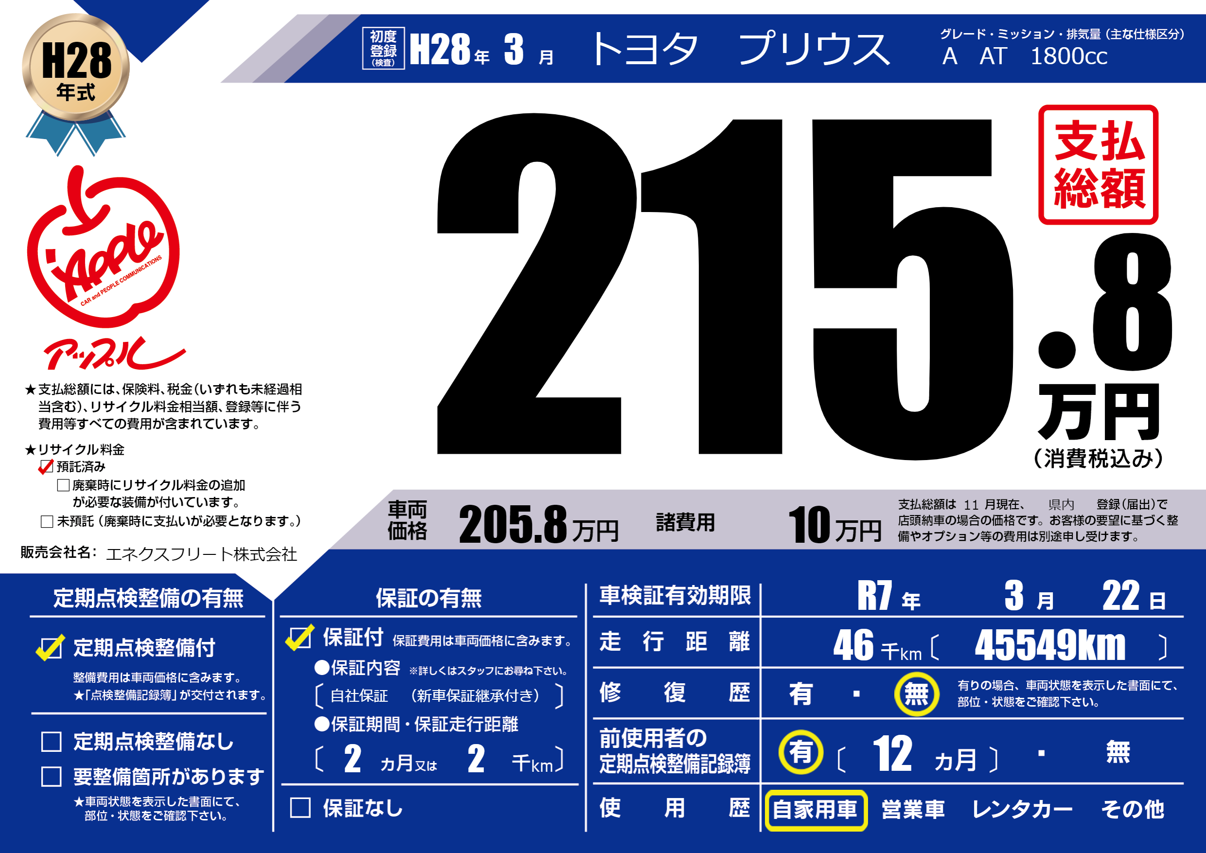 | 車検制限 | R7年 3月 22日 | ||