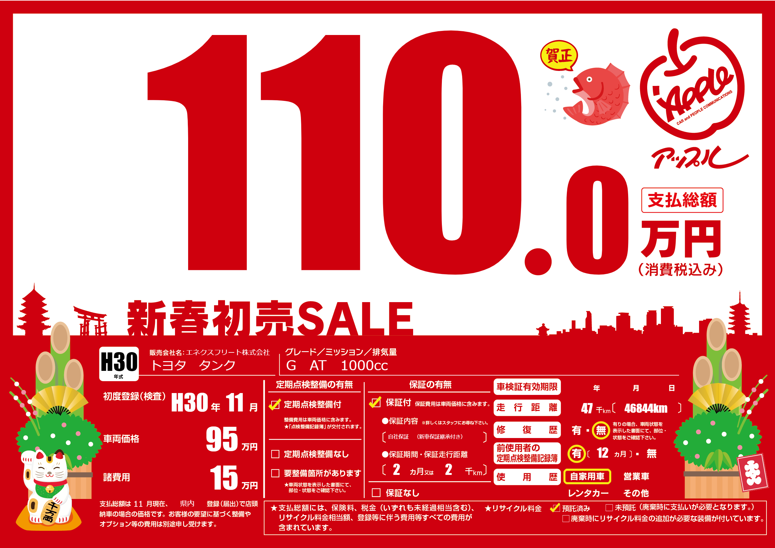 | 車名 | トヨタ タンク | グレード ミッション 排気量 |