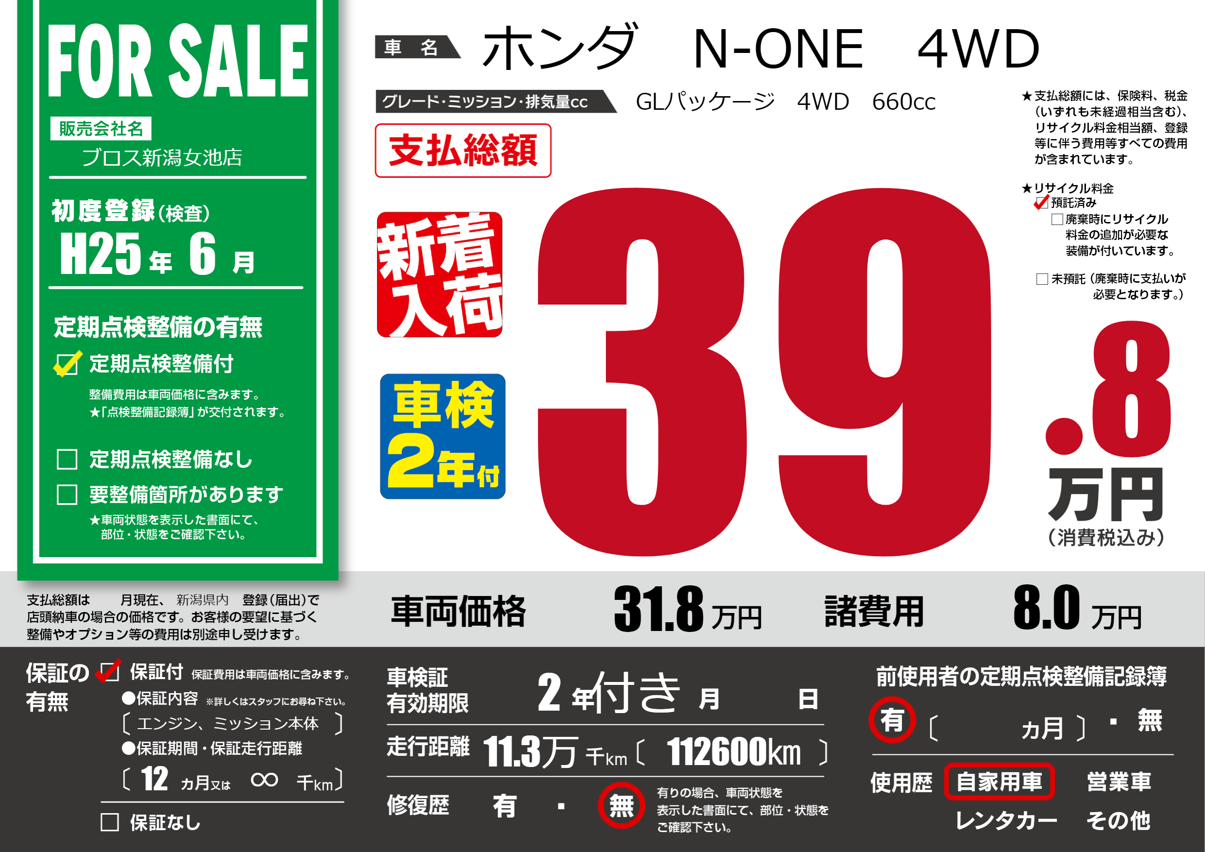 | 車名 | ホンダ N-ONE 4WD | グレード ミッション 排気量 |