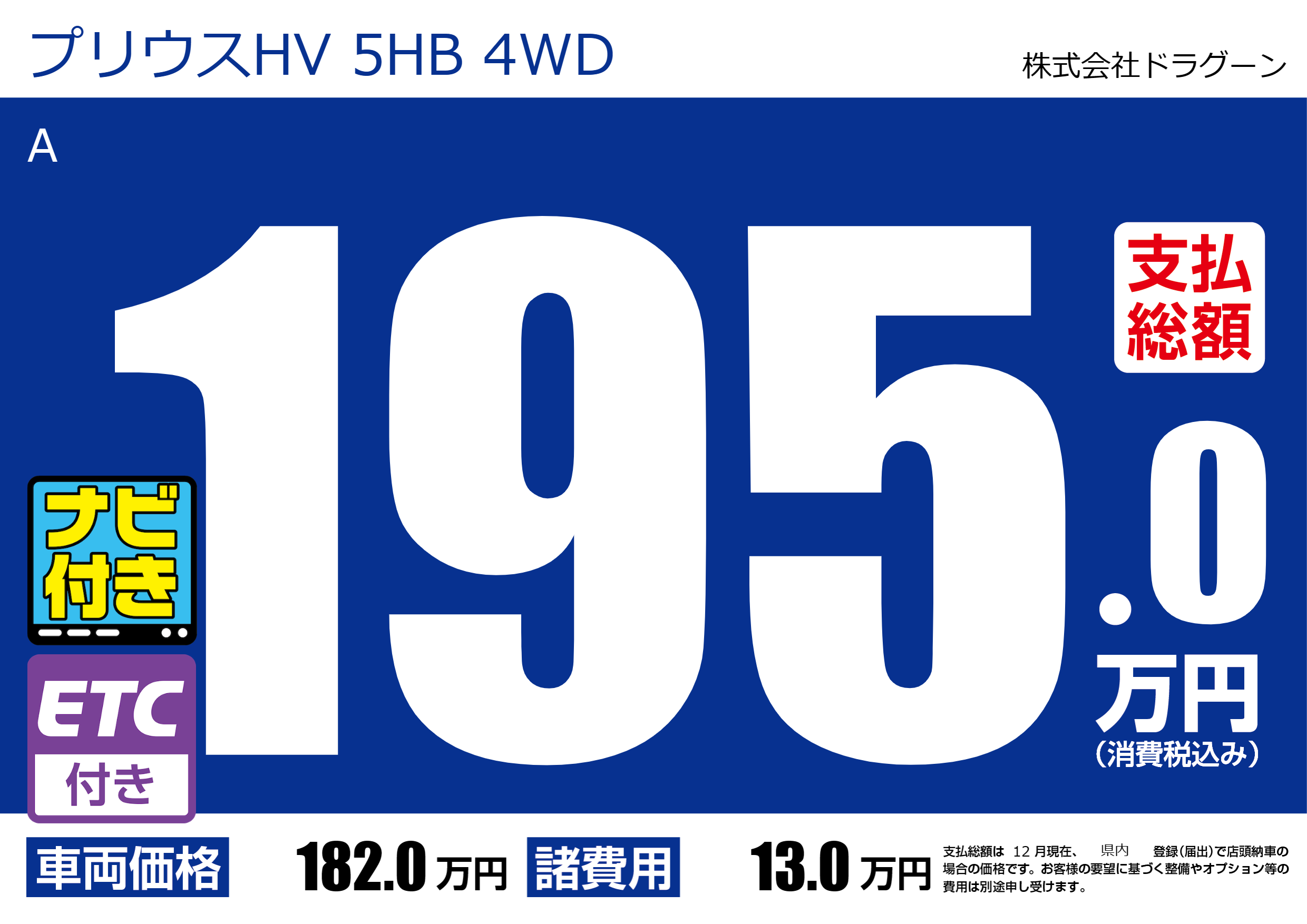 | 車名 | プリウスHV 5HB 4WD | グレード ミッション 排気量 |