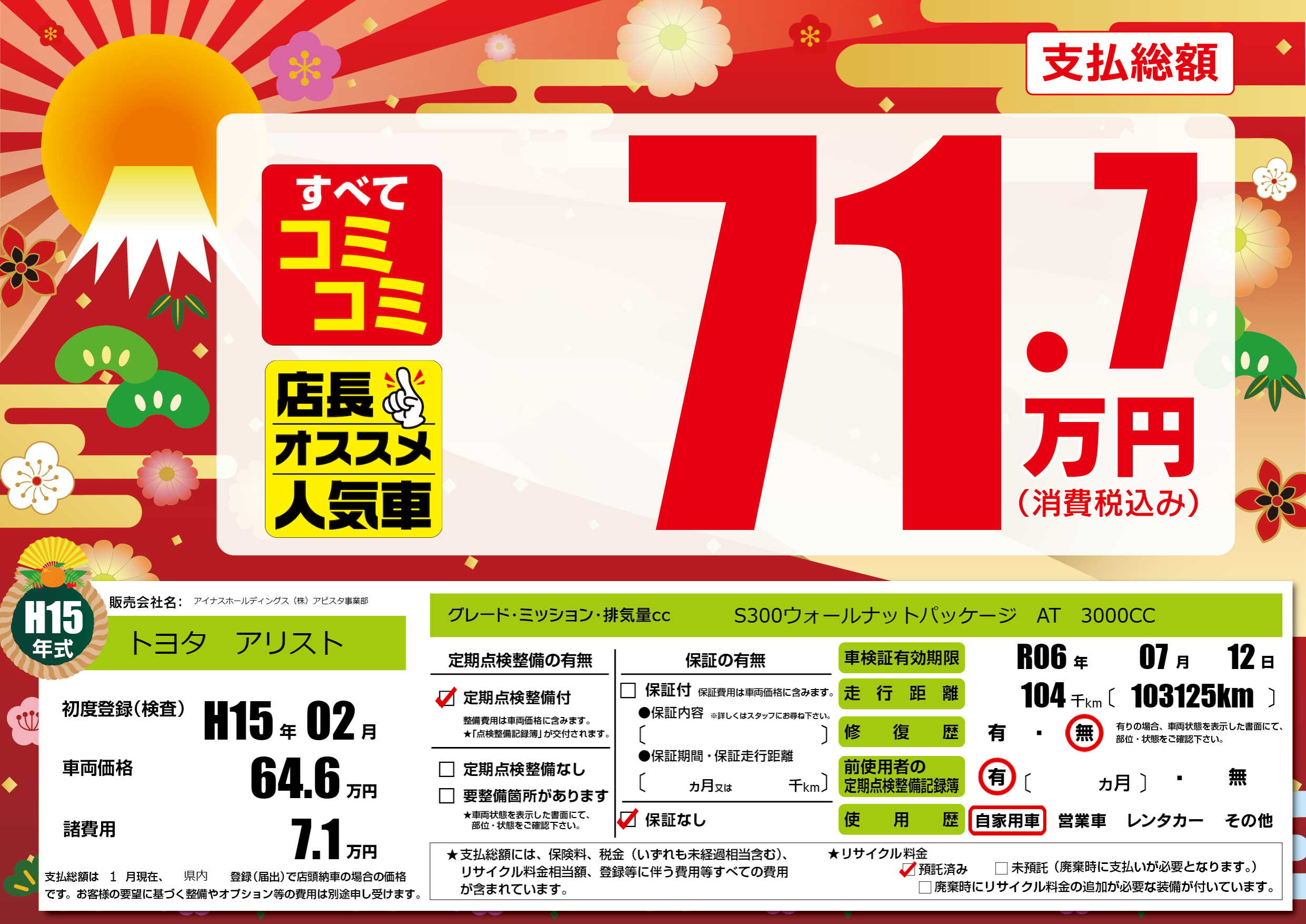 | 車名 | トヨタ アリスト | グレード ミッション 排気量 |