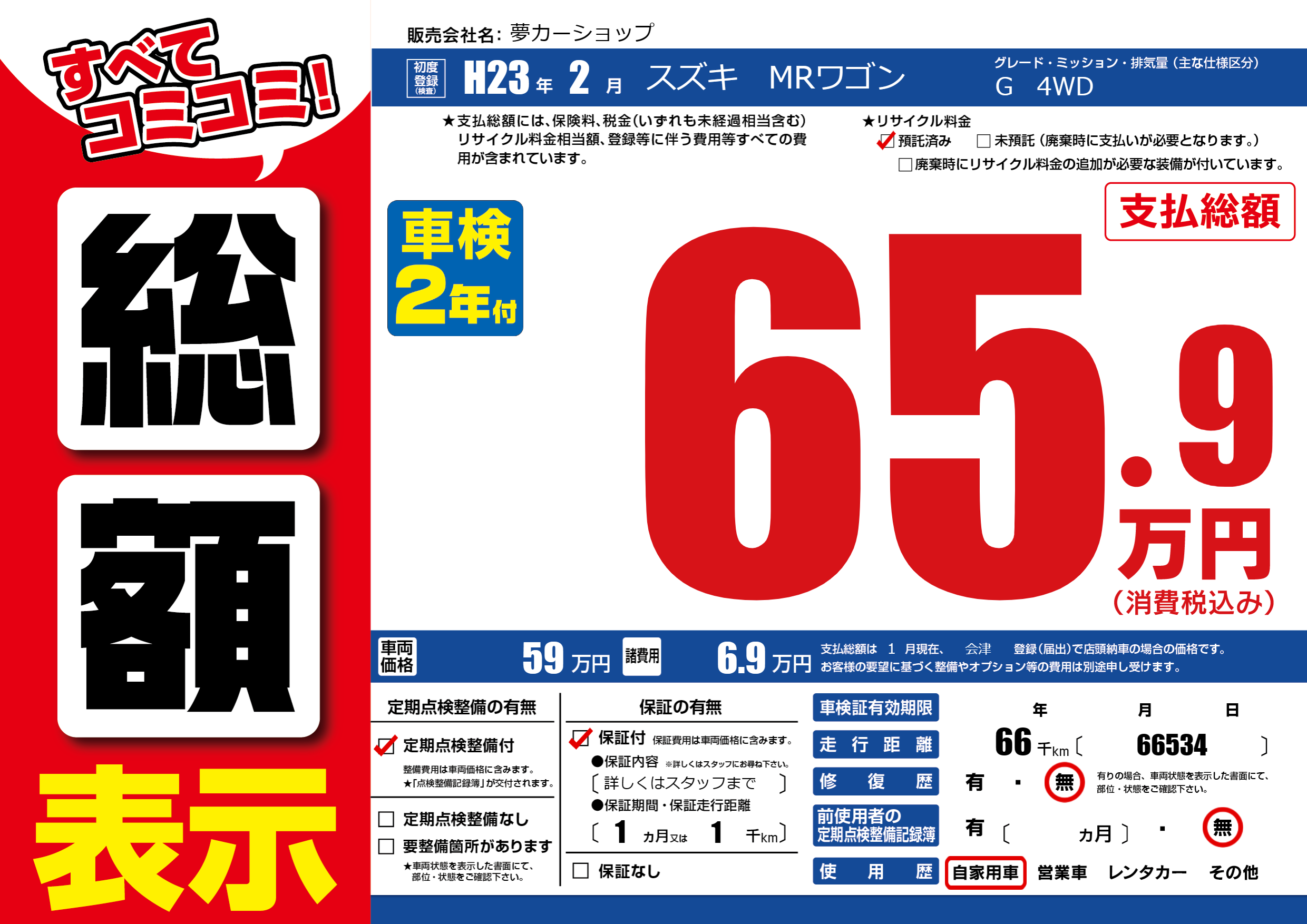 | 走行キロ | 6.6万km | 初年度登録 | H23年2月 |