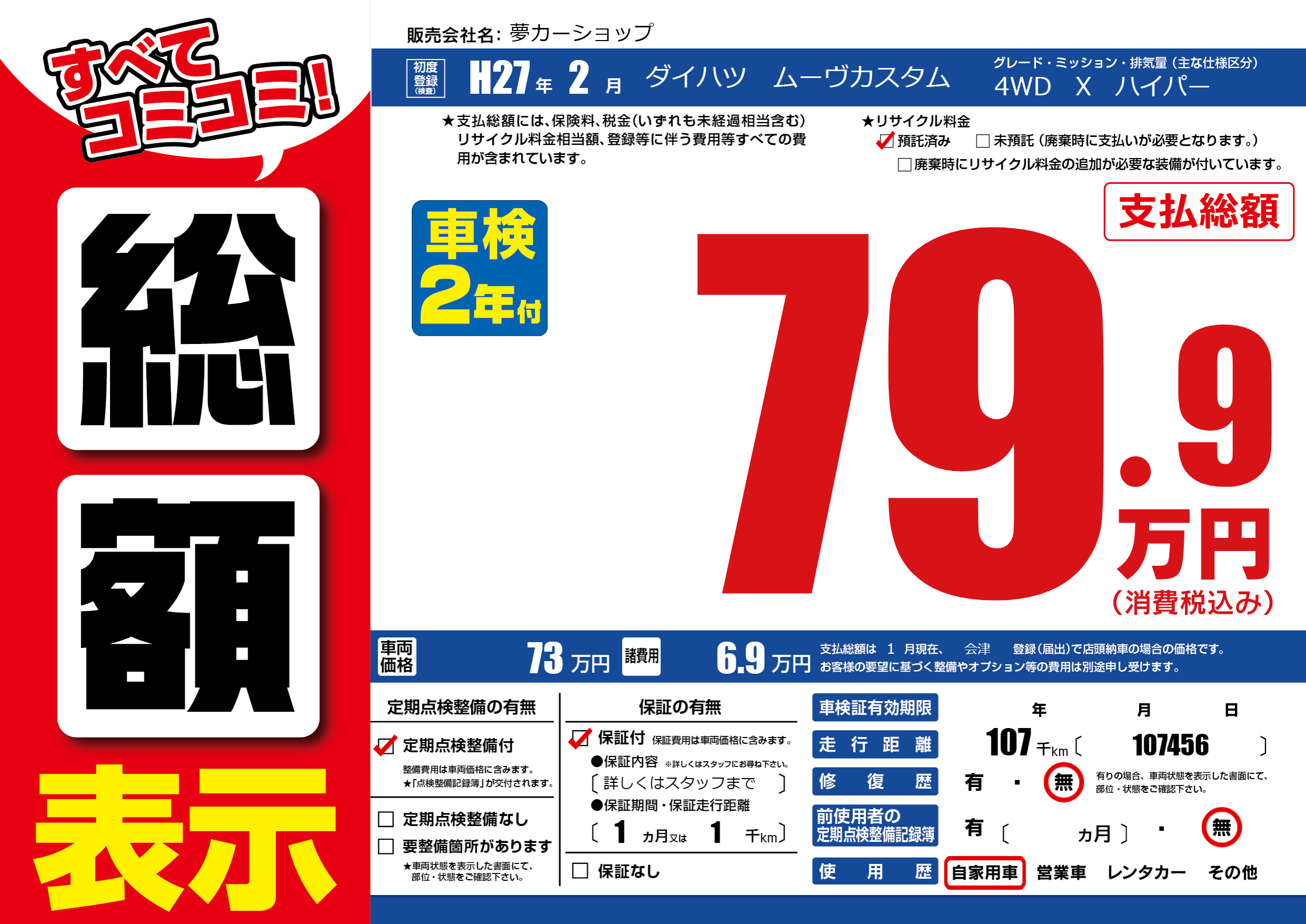 | 走行キロ | 10.7万km | 初年度登録 | H27年2月 |