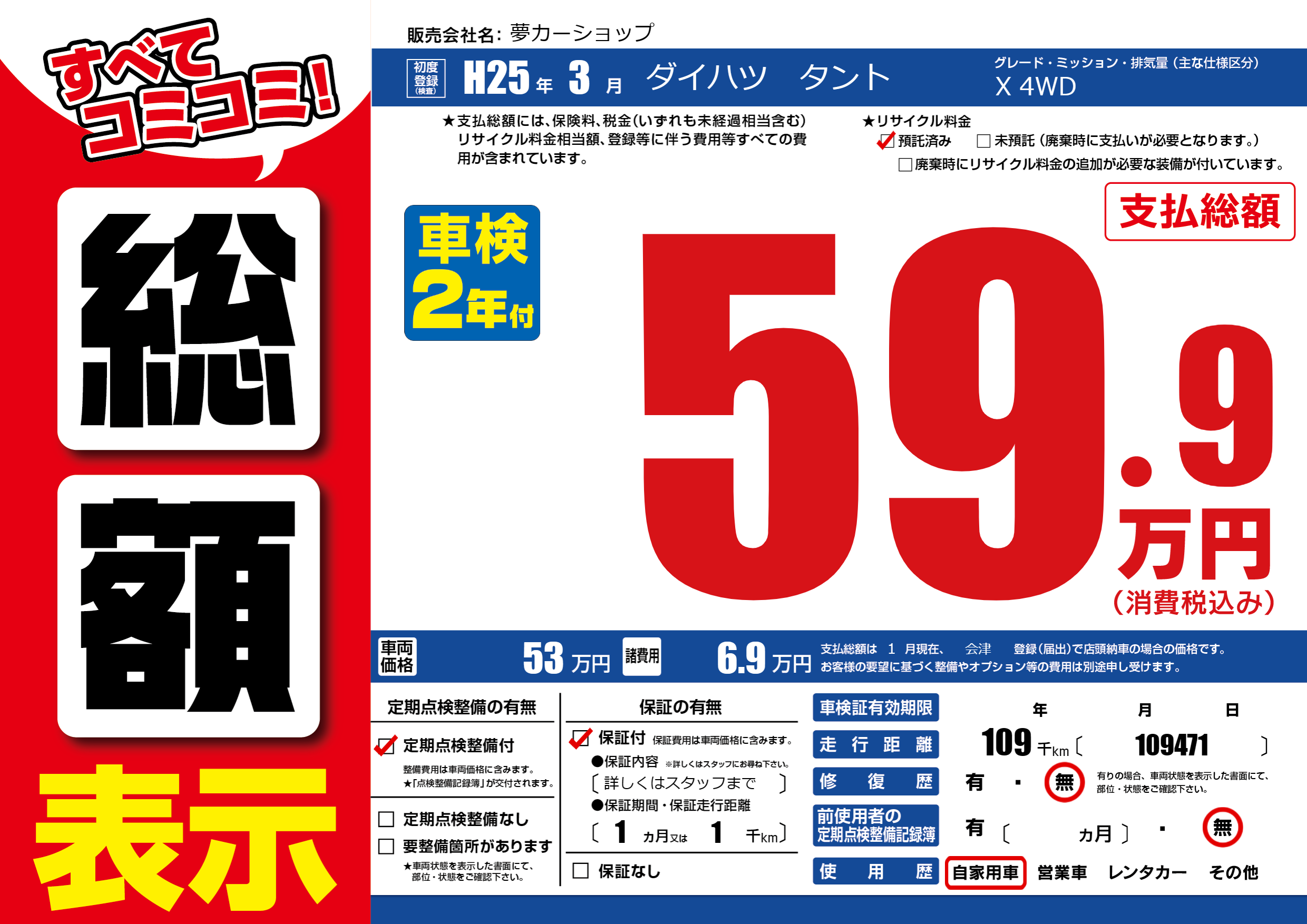 | 車名 | ダイハツ タント | グレード ミッション 排気量 |