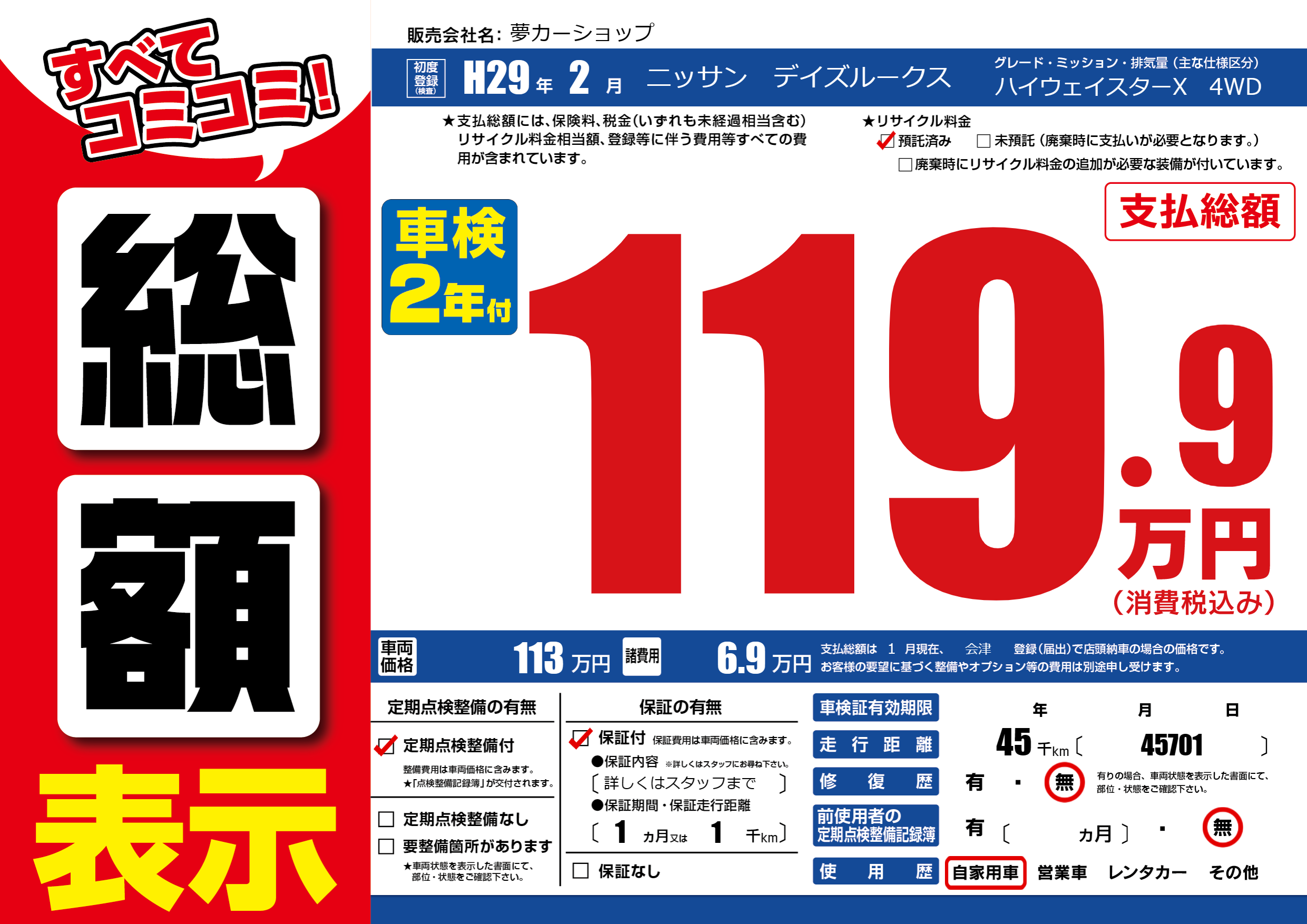 | 車名 | ニッサン デイズルークス | グレード ミッション 排気量 |