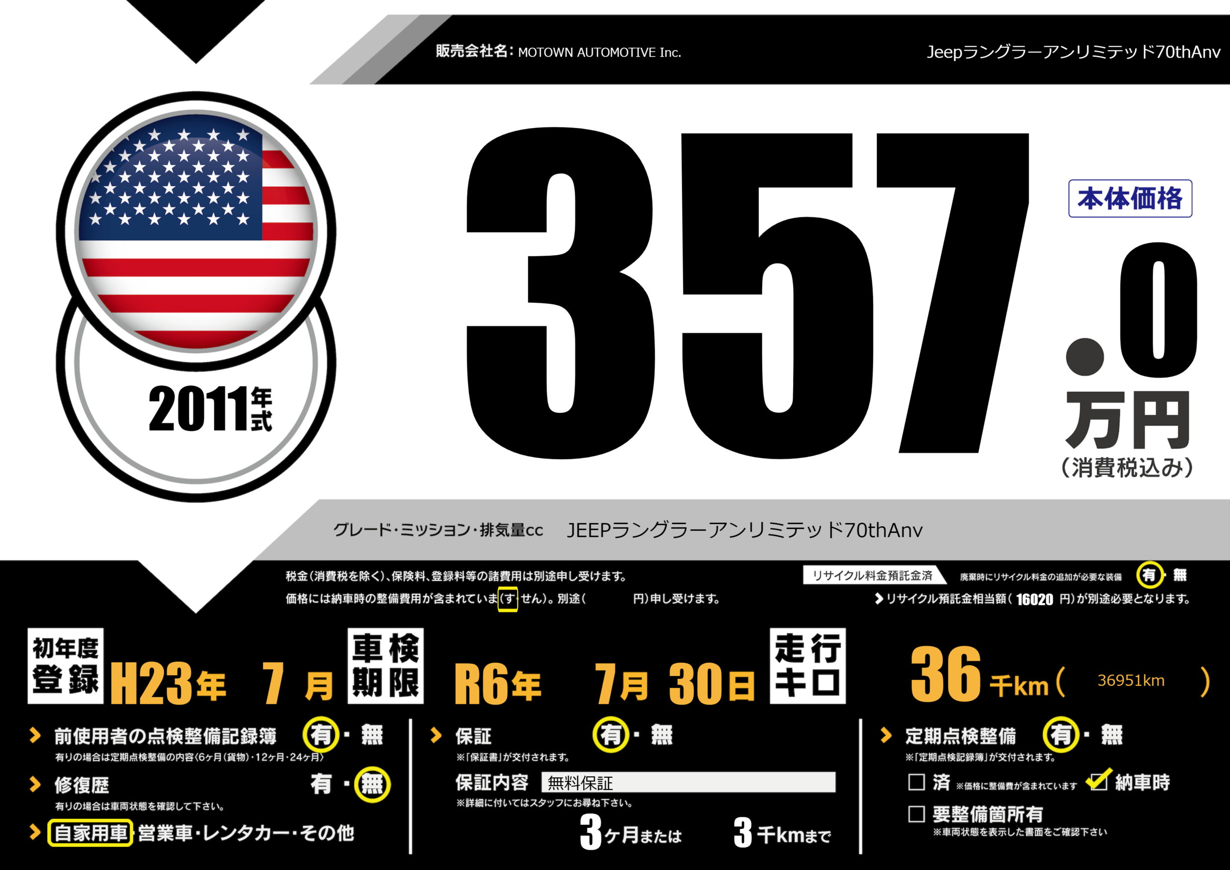 | 車名 | Jeepラングラーアンリミテッド70thAnv | グレード ミッション 排気量 |