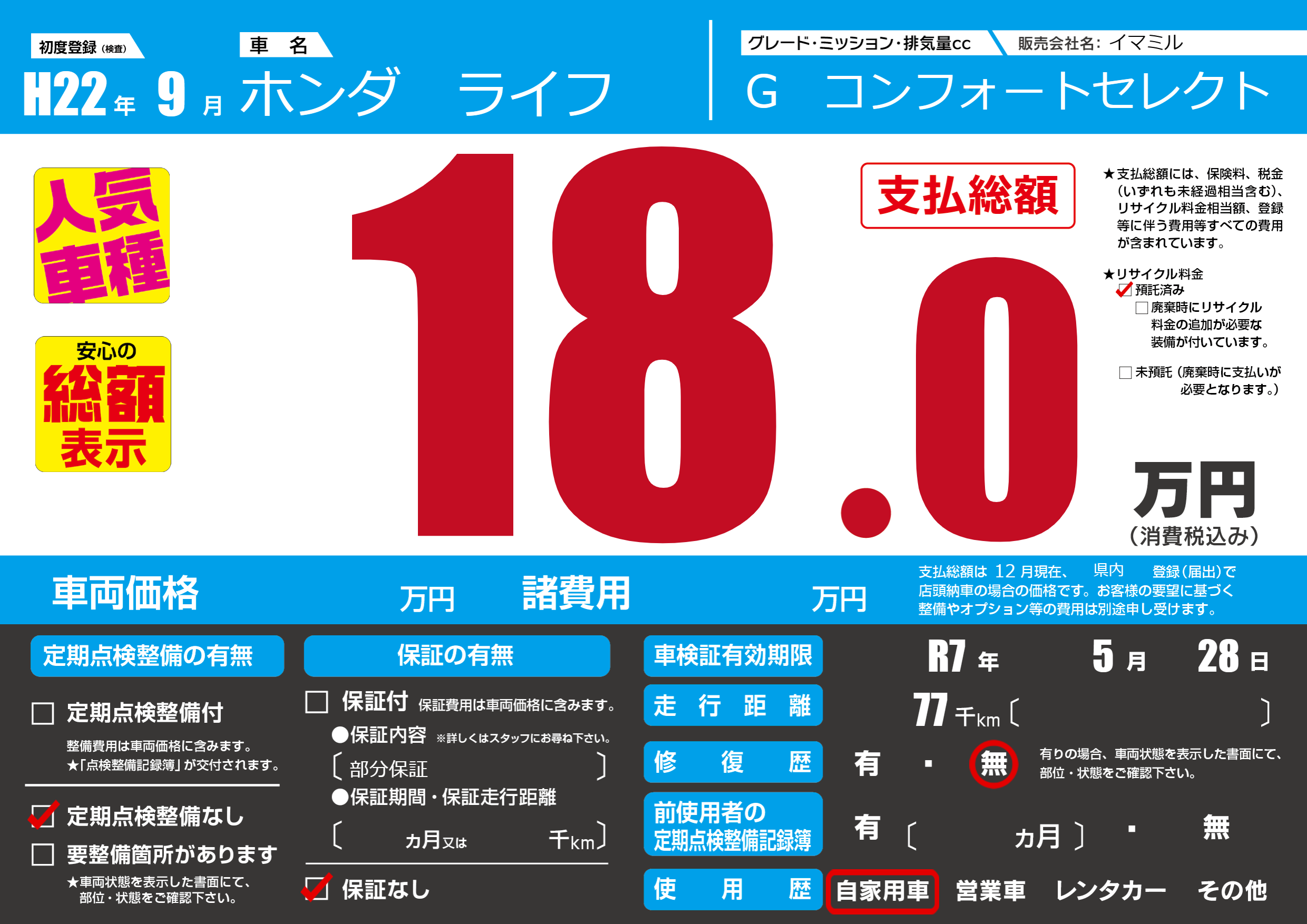 | 走行キロ | 7.7万km | 初年度登録 | H22年9月 |