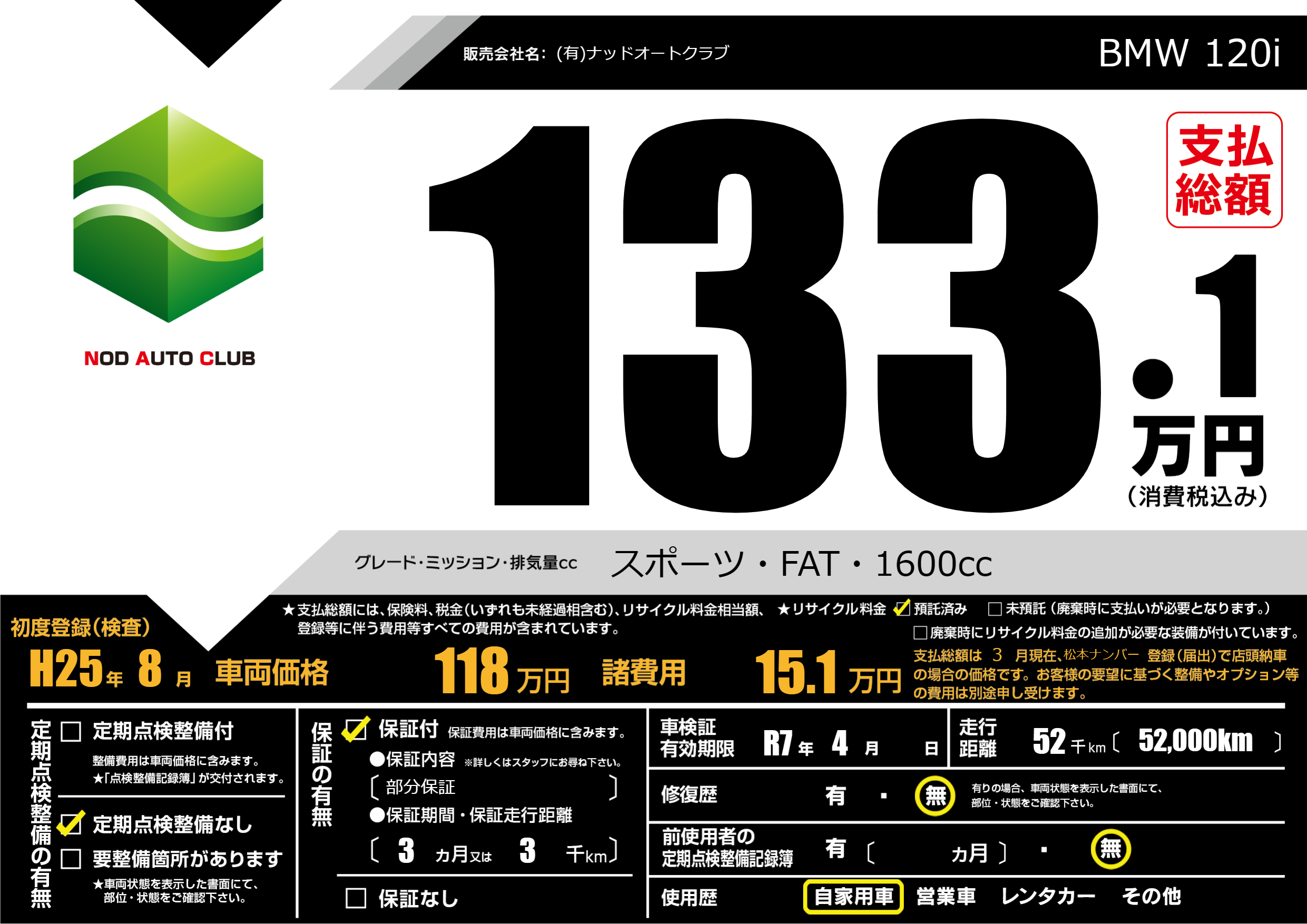 | 車名 | BMW 120i | グレード ミッション 排気量 |