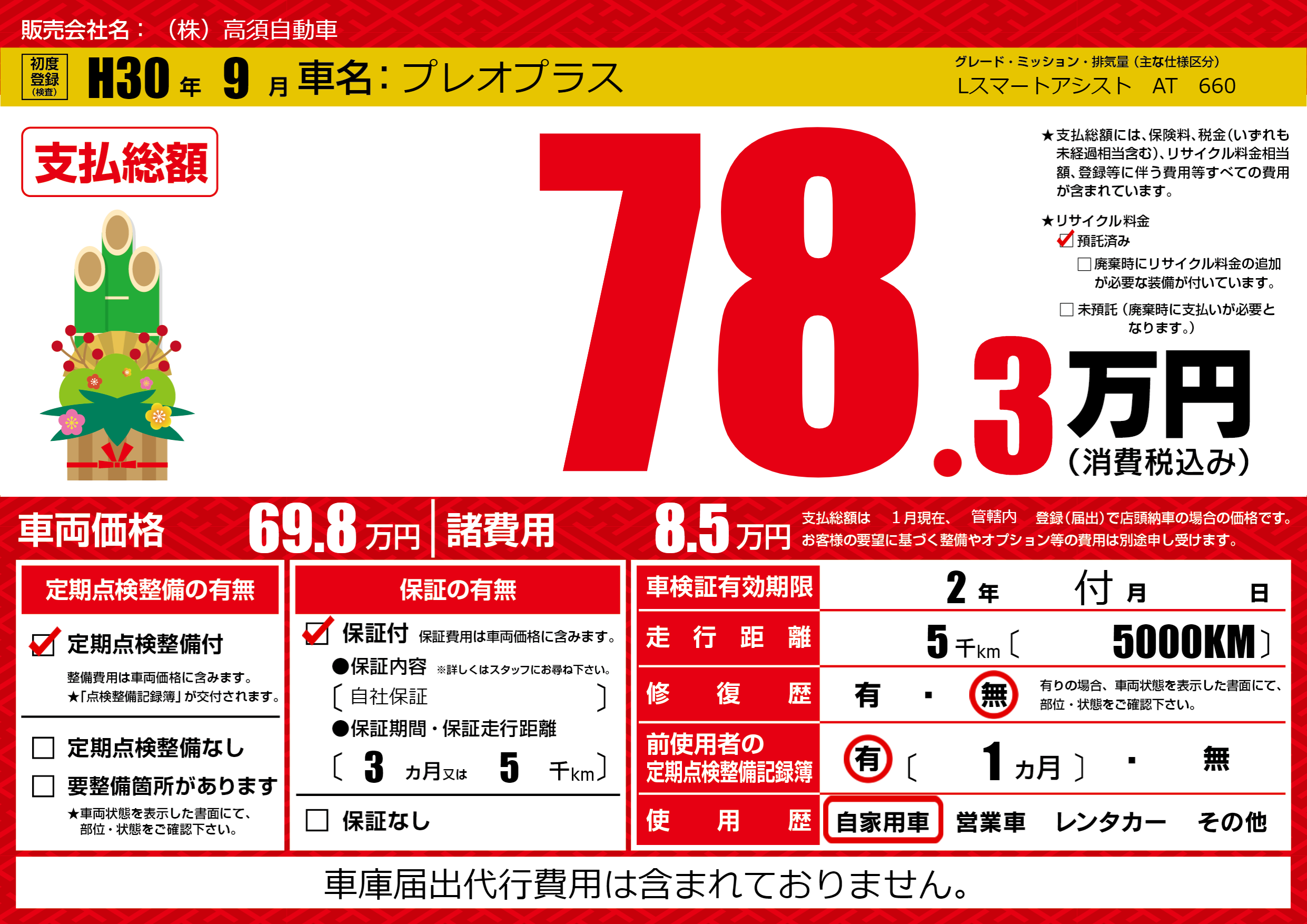 | 車名 | プレオプラス | グレード ミッション 排気量 |