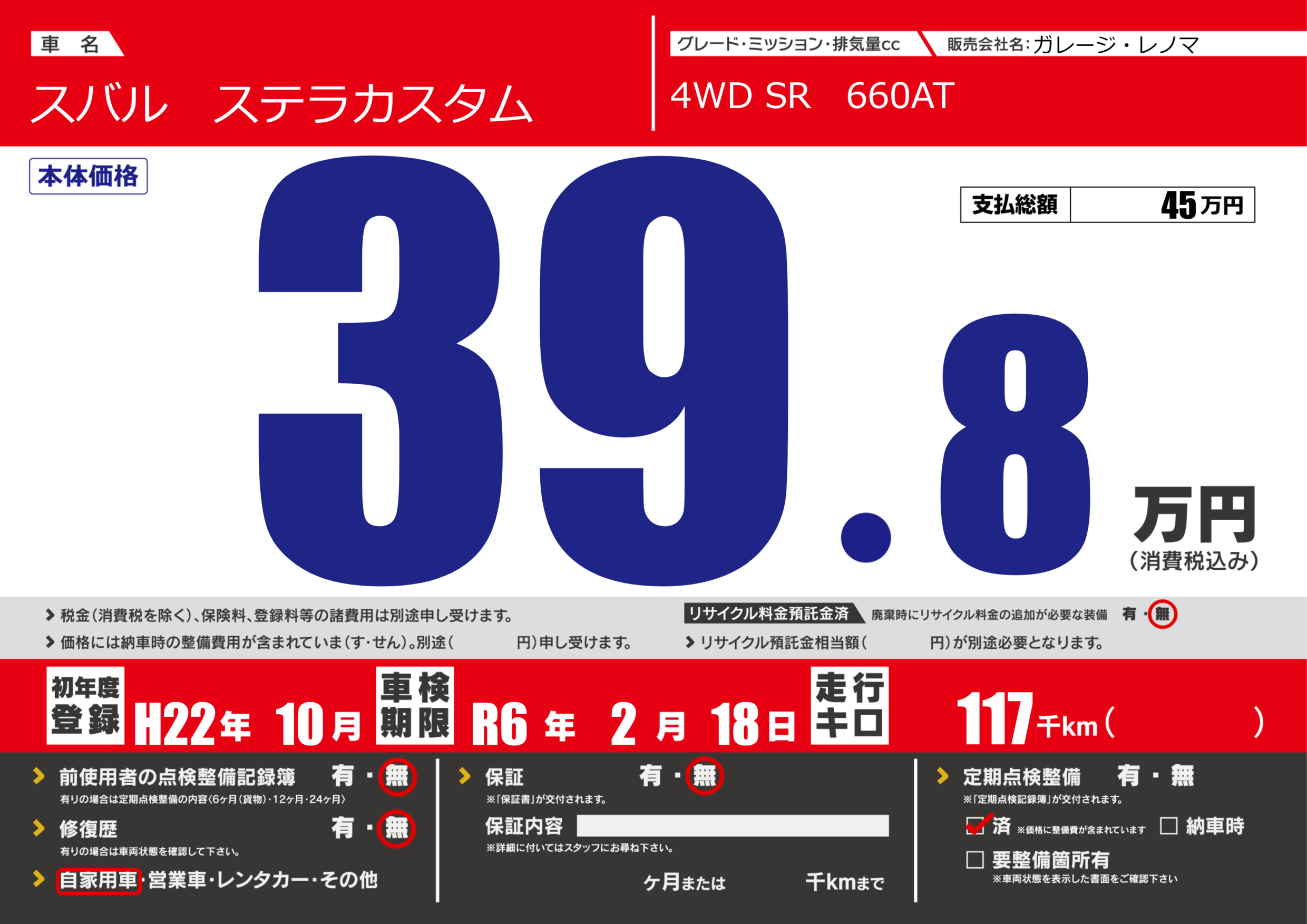 | 車名 | スバル ステラカスタム | グレード ミッション 排気量 |