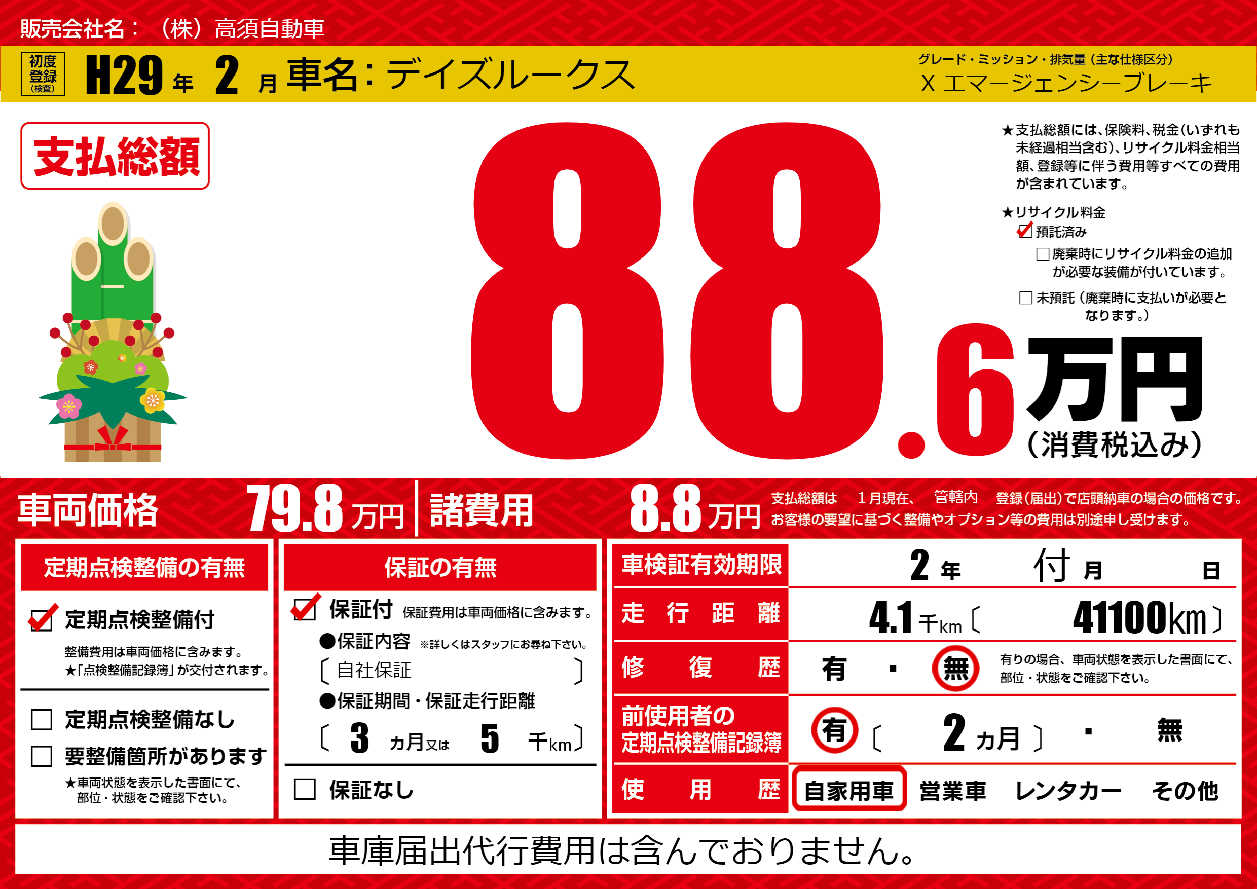 | 走行キロ | 0.4万km | 初年度登録 | H29年2月 |