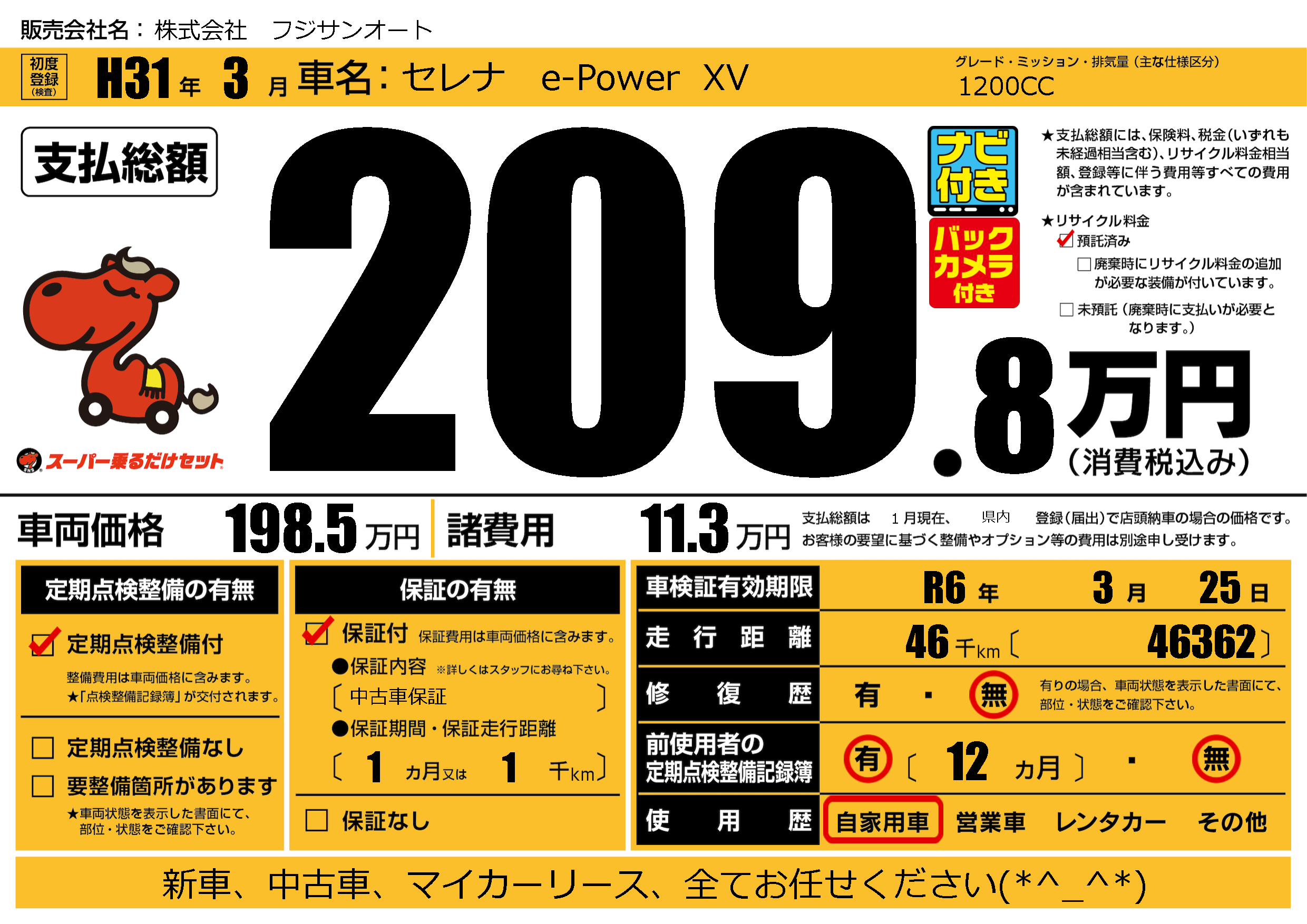 | 車名 | セレナ e-Power XV | グレード ミッション 排気量 |
