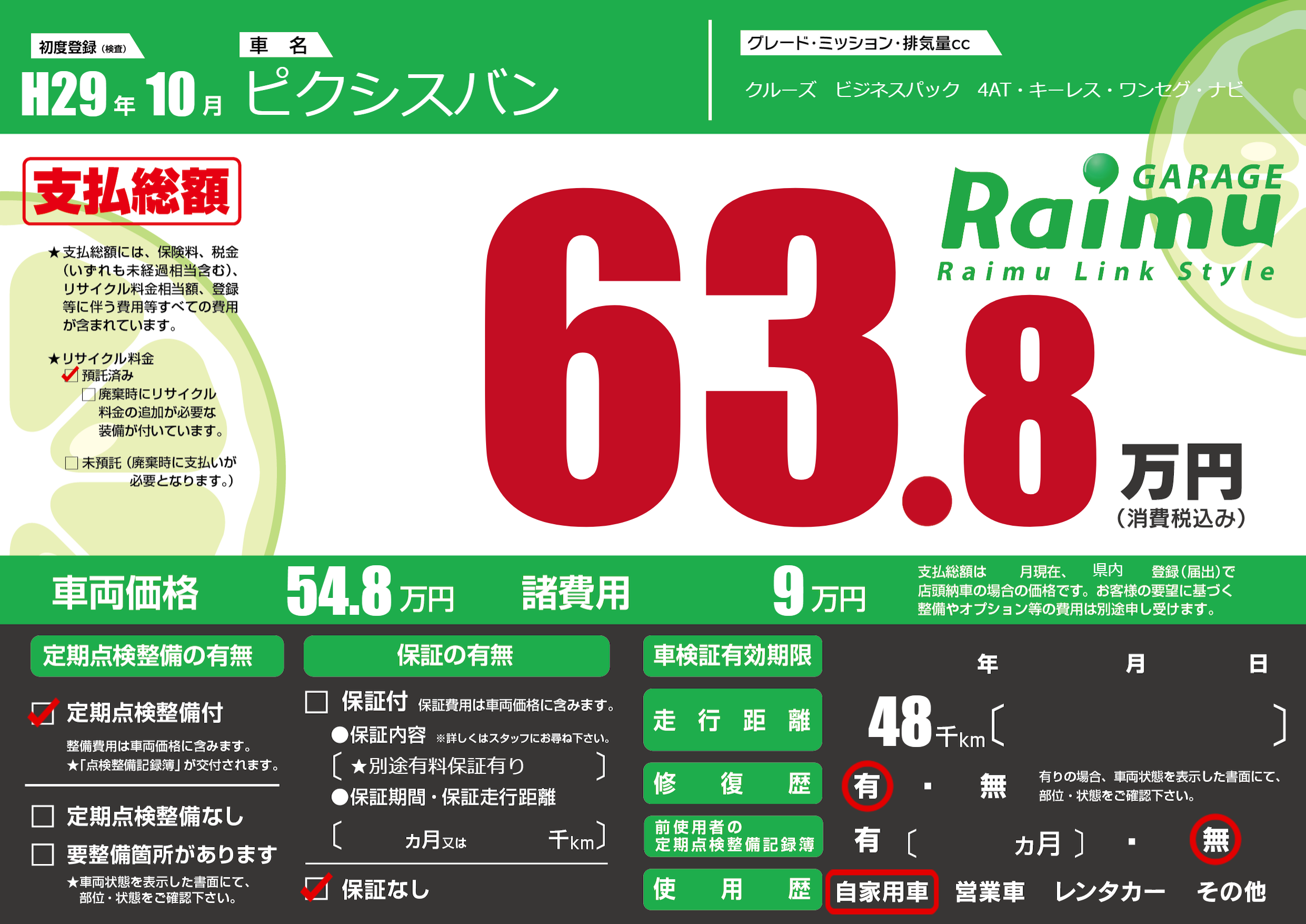 保証なし 保証内容(★別途有料保証有り) ---ヶ月または()千kmまで |